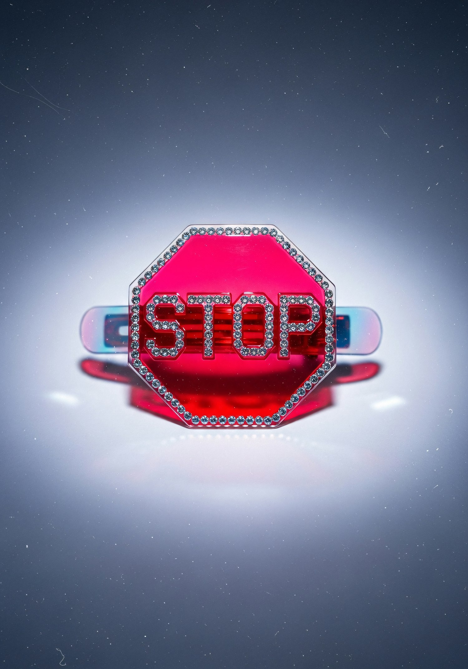 A bold red stop sign-inspired accessory with rhinestone details, set against a gradient background for a striking visual effect.
