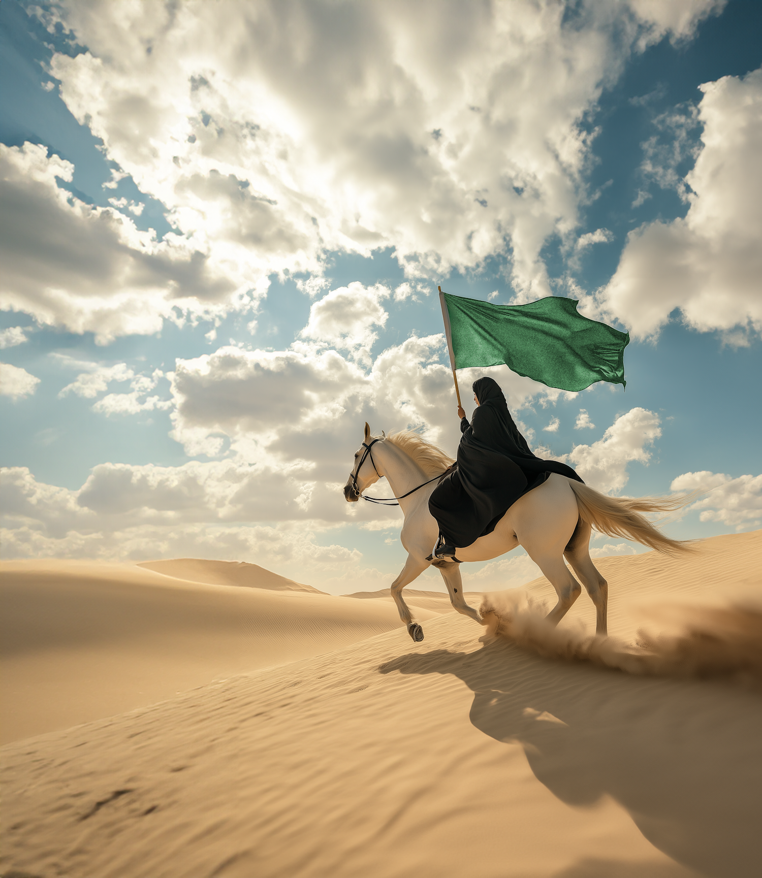A rider in black on a white horse gallops through the desert, holding a green flag against a blue sky with clouds.