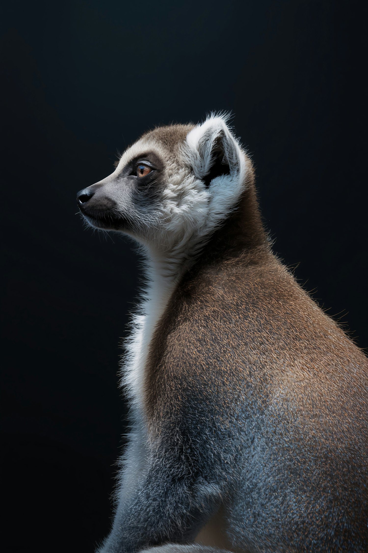 A stunning side profile of a ring-tailed lemur with detailed fur texture and expressive amber eyes against a dark background.