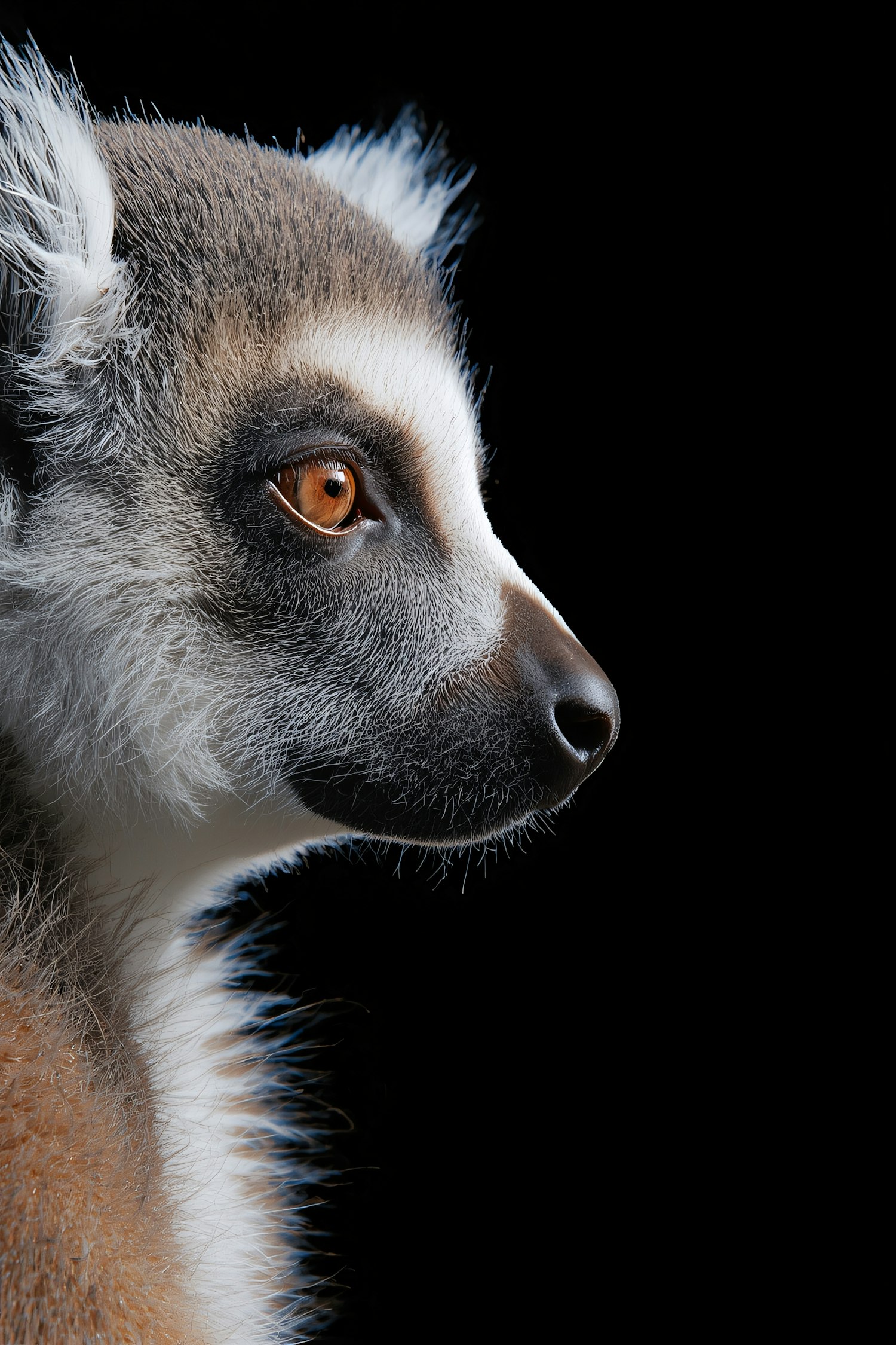 Close-up of a ring-tailed lemur's profile with detailed fur texture and a striking orange eye against a black background.