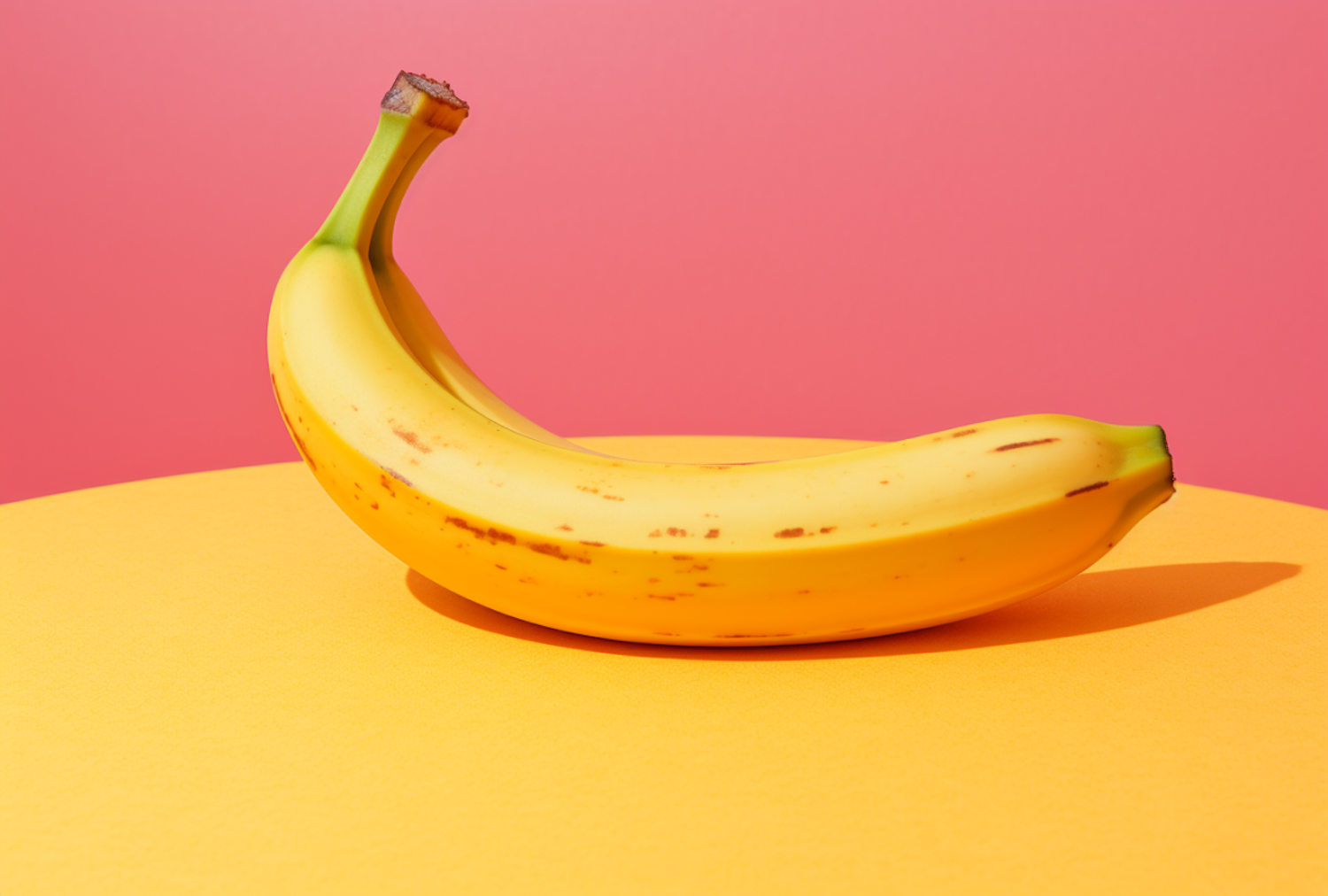 A ripe banana on a vibrant yellow surface against a bold pink background, creating a striking and colorful composition.