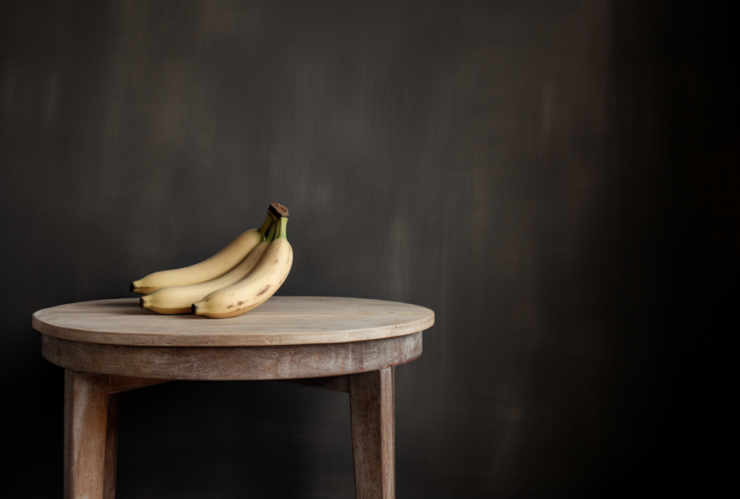 A bunch of ripe bananas on a small wooden table against a dark background, creating a minimalist and serene composition.