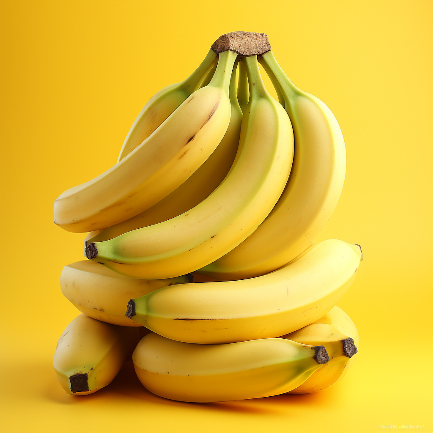 A bunch of ripe bananas stacked against a bright yellow background, showcasing freshness and vibrant color.