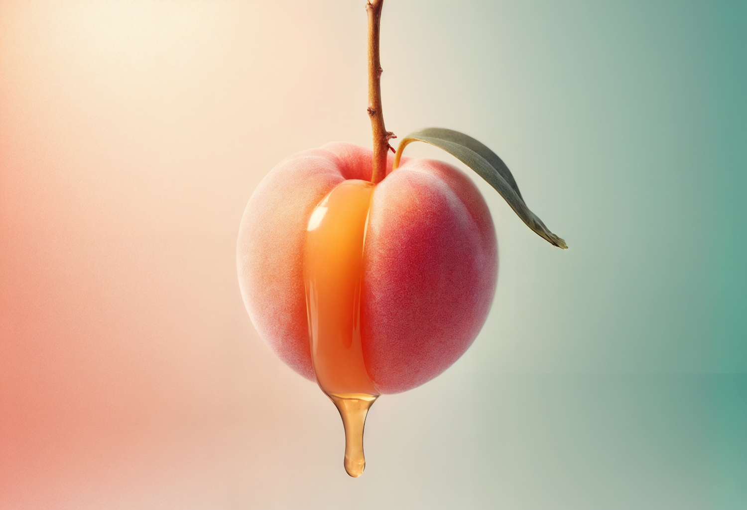 A vibrant peach with golden liquid dripping, set against a pastel gradient background, showcasing its natural beauty and freshness.