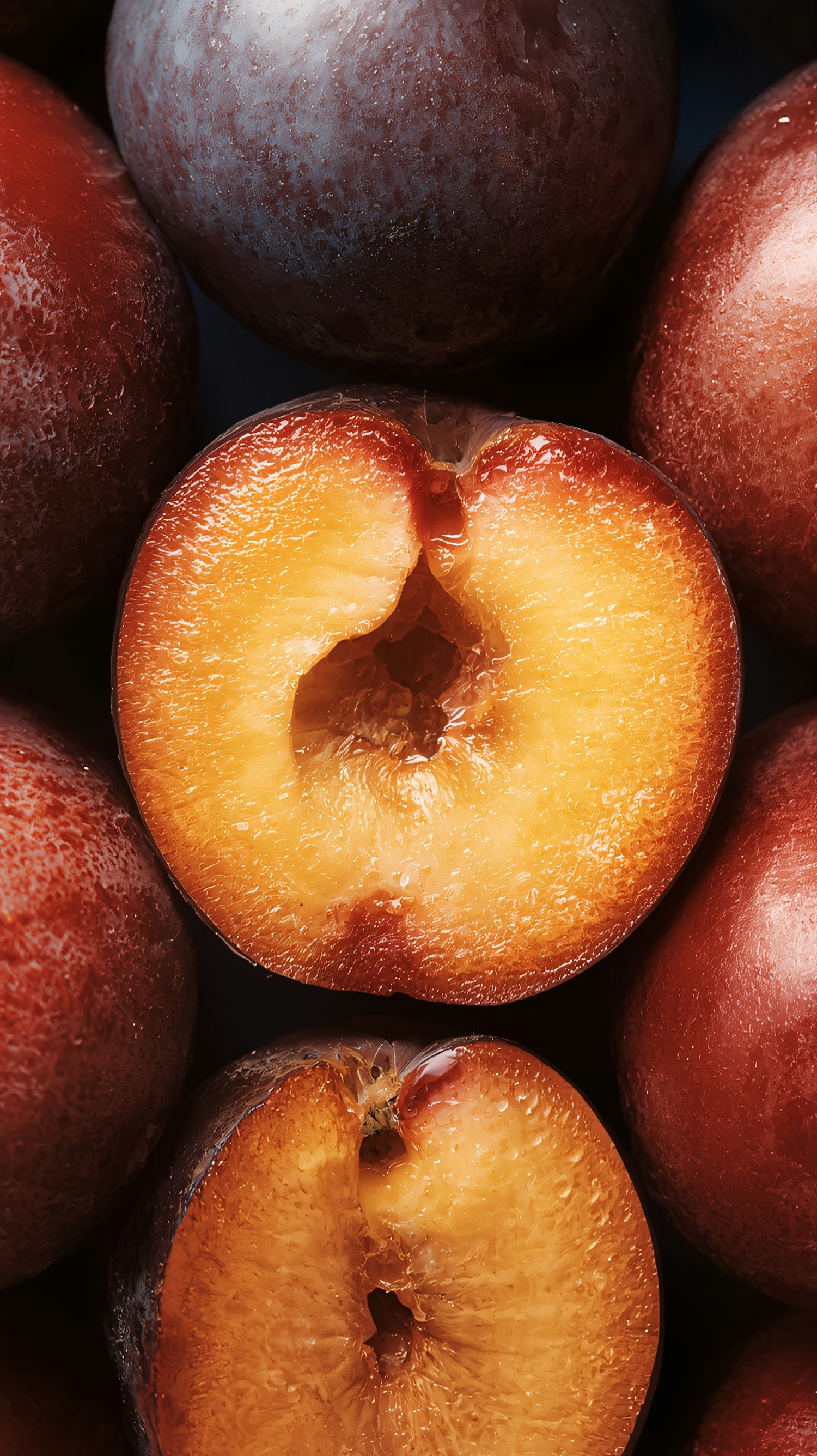 Close-up of ripe plums, one halved to reveal juicy golden flesh, surrounded by deep red and purple plums with a natural sheen.