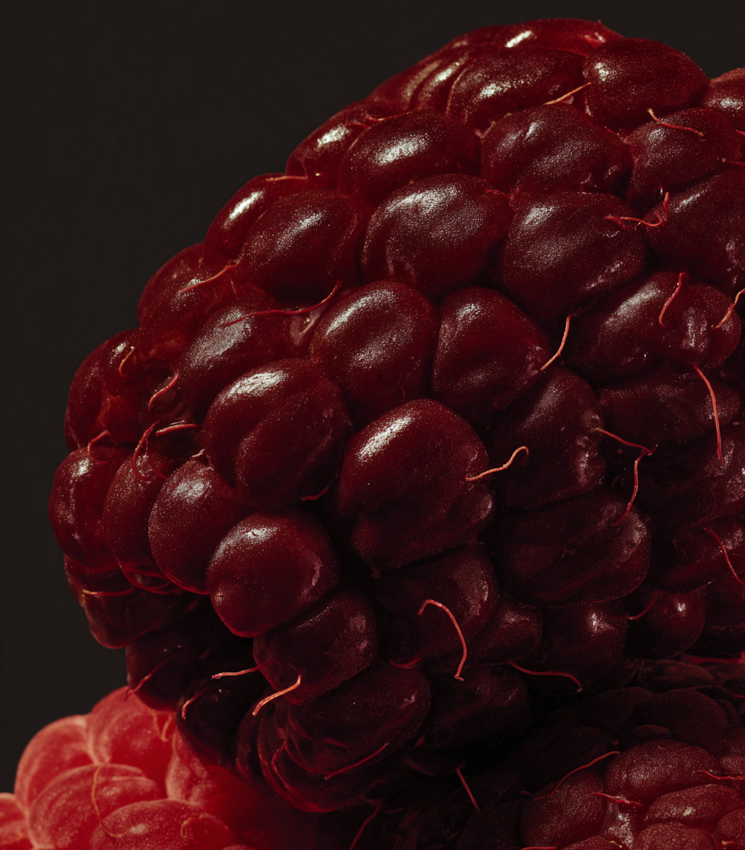 Close-up of a ripe raspberry with detailed texture and vibrant red color, set against a dark background for striking contrast.