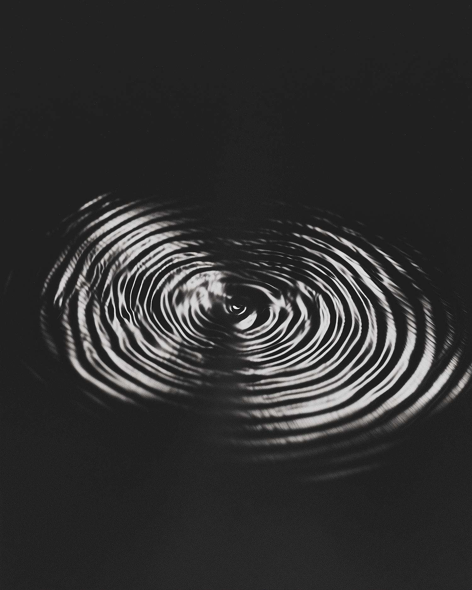 Hypnotic black-and-white ripples on water, radiating in concentric circles against a deep black background. Minimalist and calming.
