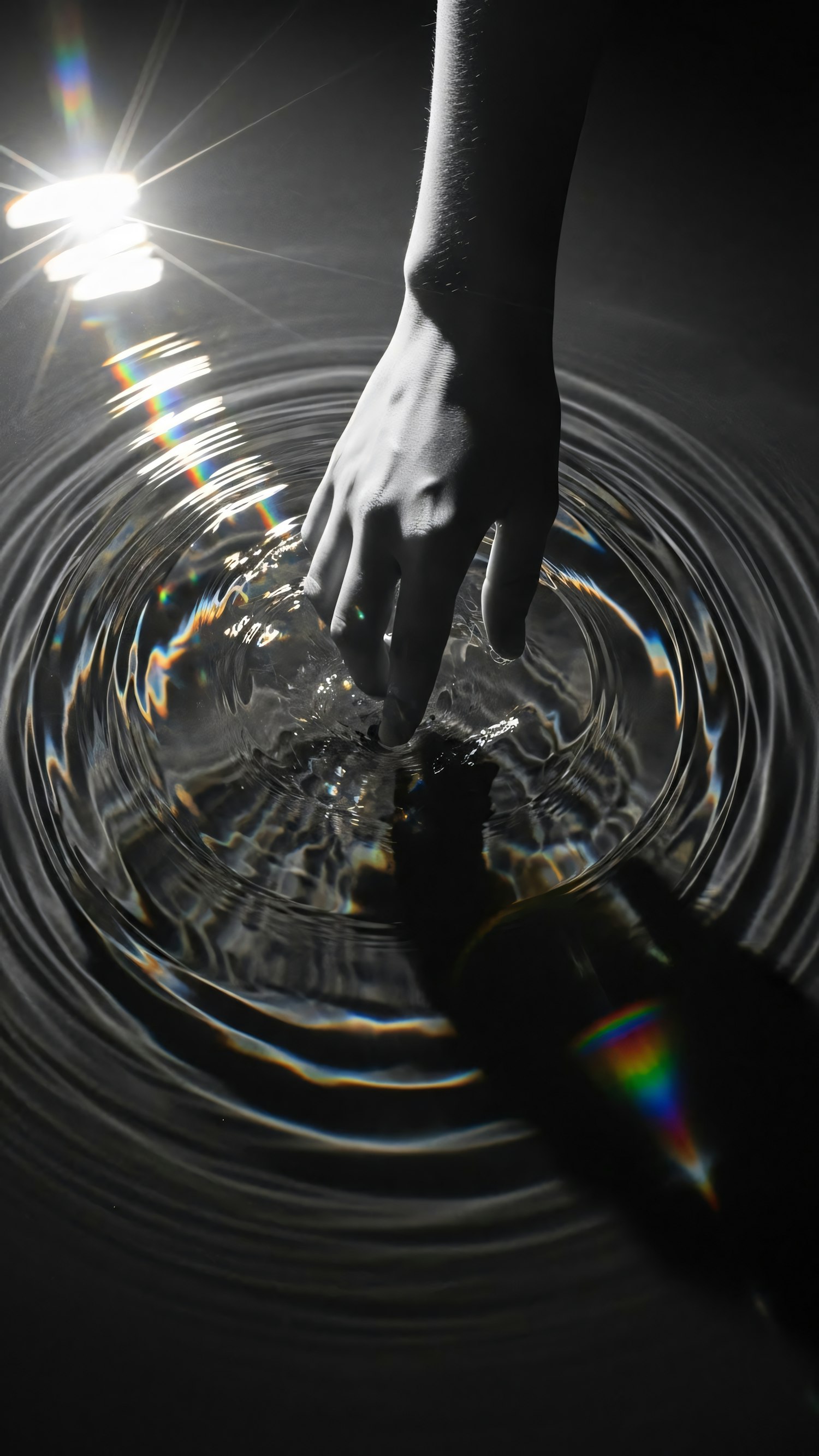 A hand touches water, creating ripples under dramatic lighting with colorful reflections, emphasizing motion and light interplay.