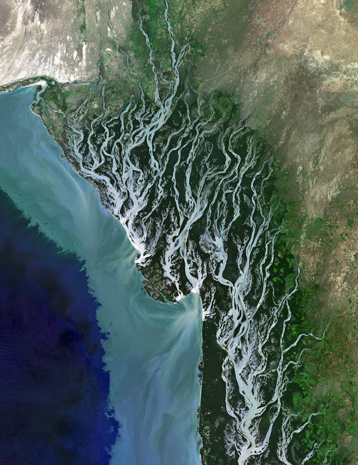Satellite view of a river delta with intricate waterways, lush greenery, and vibrant ocean hues, showcasing nature's complexity.