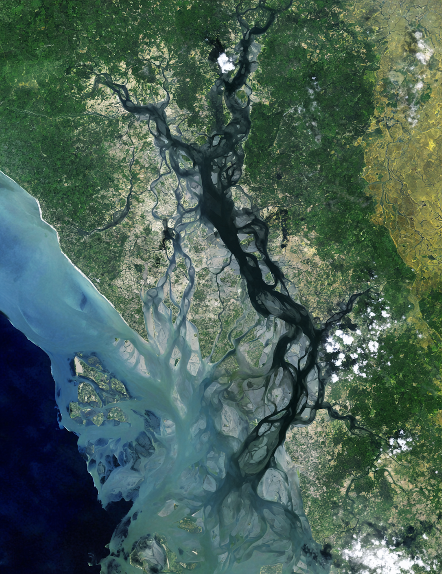 Satellite view of a river delta with intricate waterways, lush vegetation, and a transition from land to sea, showcasing natural beauty.