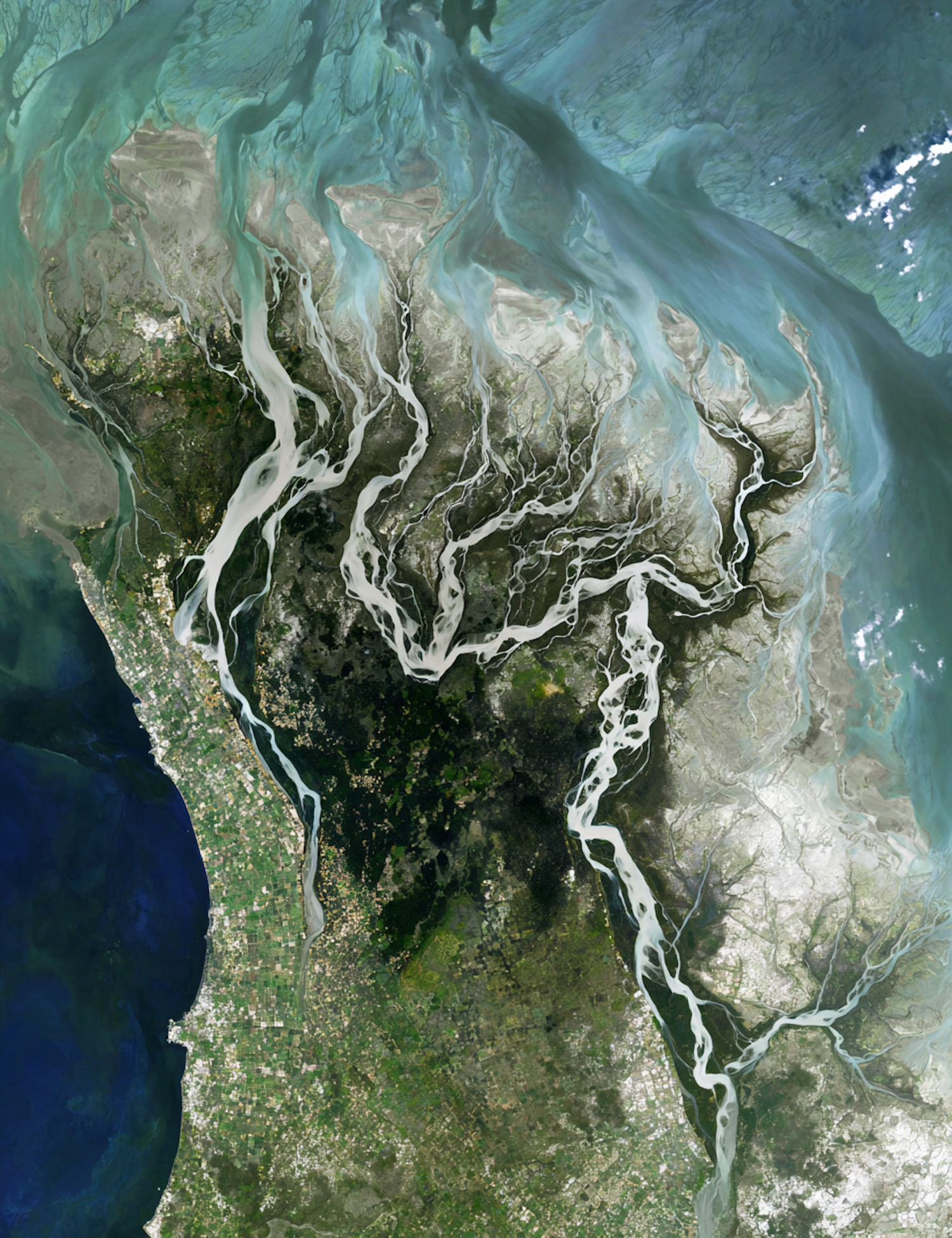 Satellite view of a river delta with intricate waterways, lush vegetation, and sediment-laden waters meeting the sea.