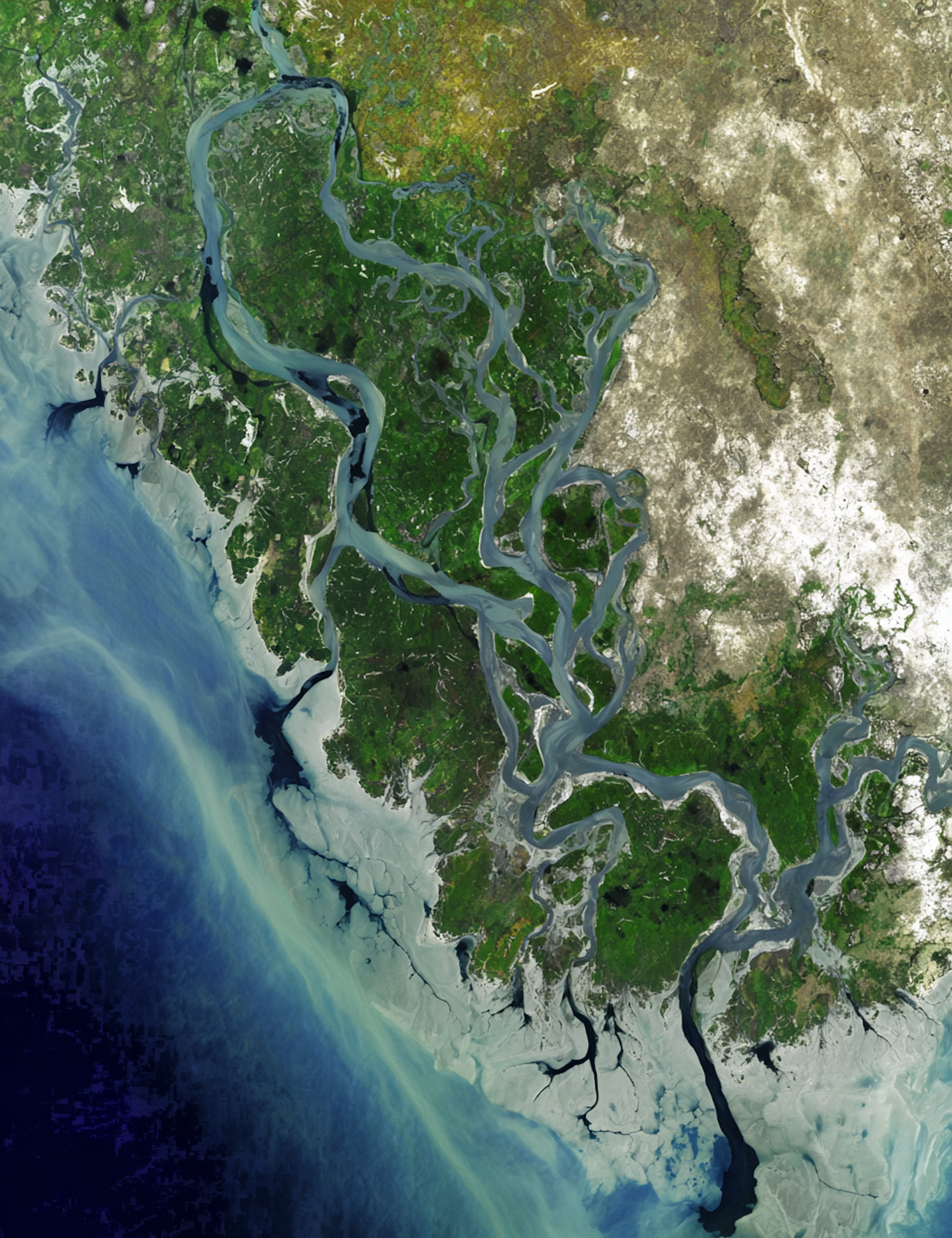 Satellite view of a river delta with intricate waterways, lush greenery, and a gradient of ocean blues meeting the land.