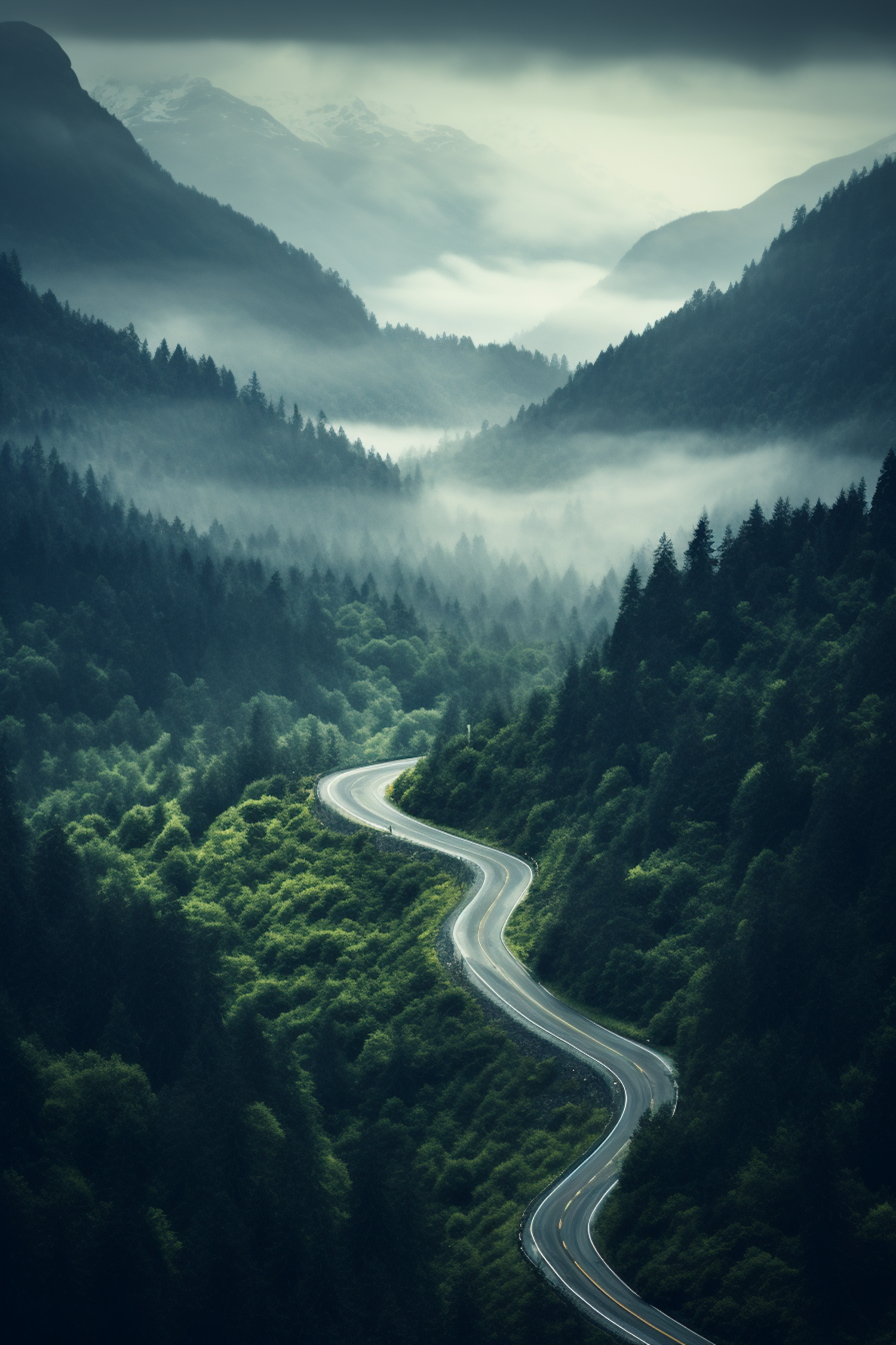 A winding road through lush green forests and misty mountains creates a serene and mystical landscape.