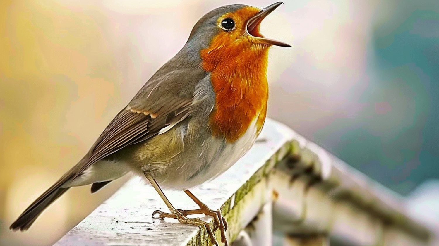 A vibrant robin with an orange-red breast sings on a weathered railing, set against a blurred background of warm and cool hues.