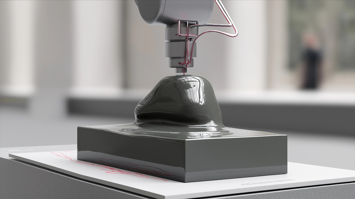 A robotic arm extrudes glossy material onto a base, forming a smooth shape. Blurred background highlights the precision of the process.