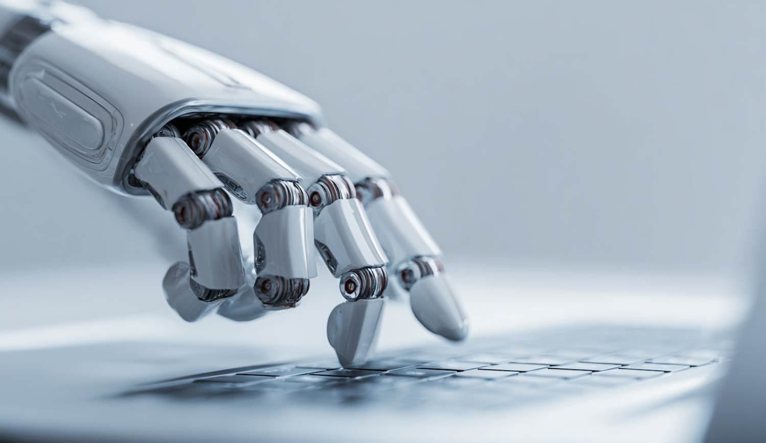 A robotic hand precisely pressing a laptop's keyboard key, symbolizing advanced technology and human-computer interaction.