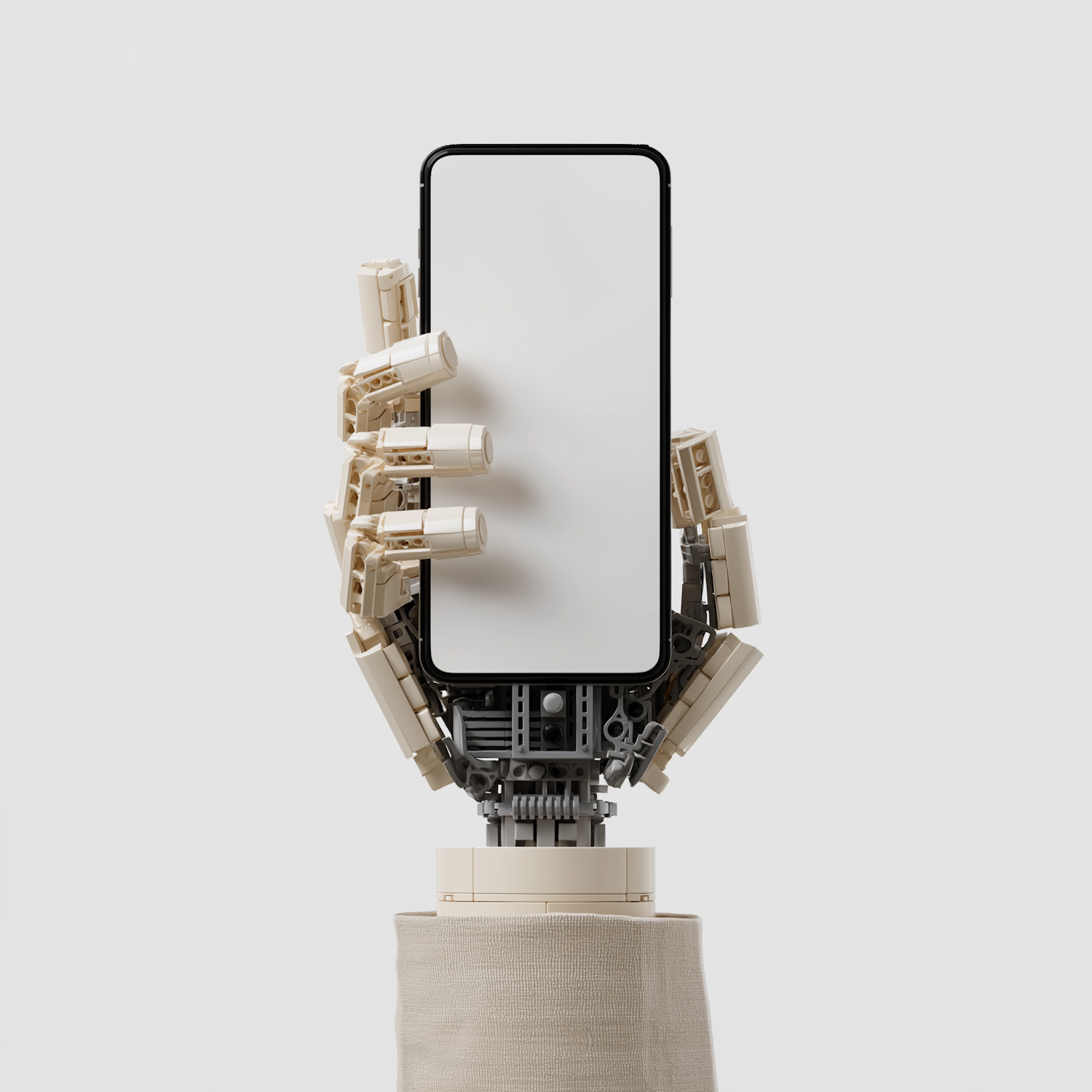 A robotic LEGO-style hand holding a smartphone with a blank screen, set against a clean white background. Futuristic and creative design.