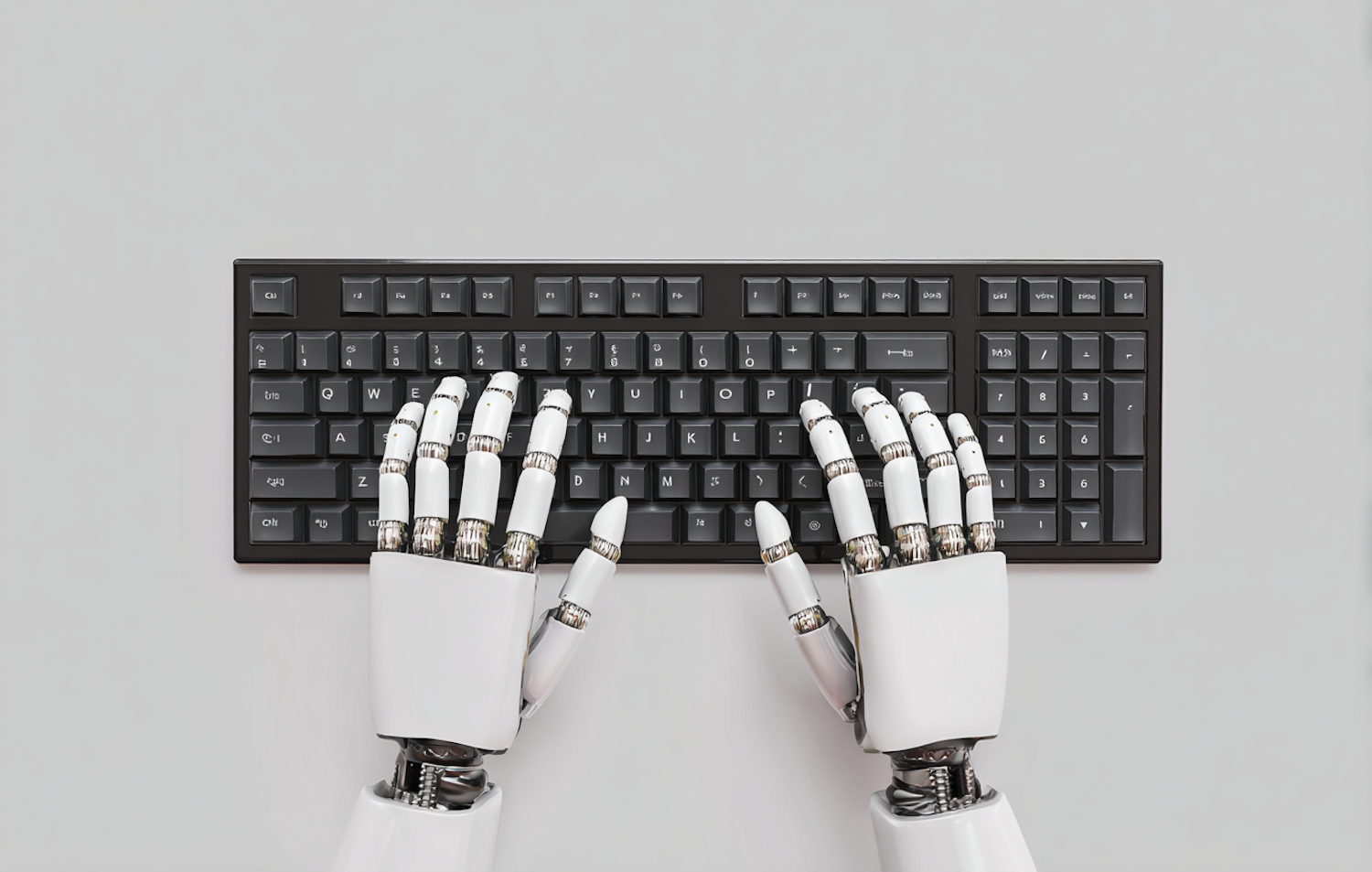 Robotic hands positioned over a computer keyboard, ready to type on the dark-gray keys against a light-gray background.