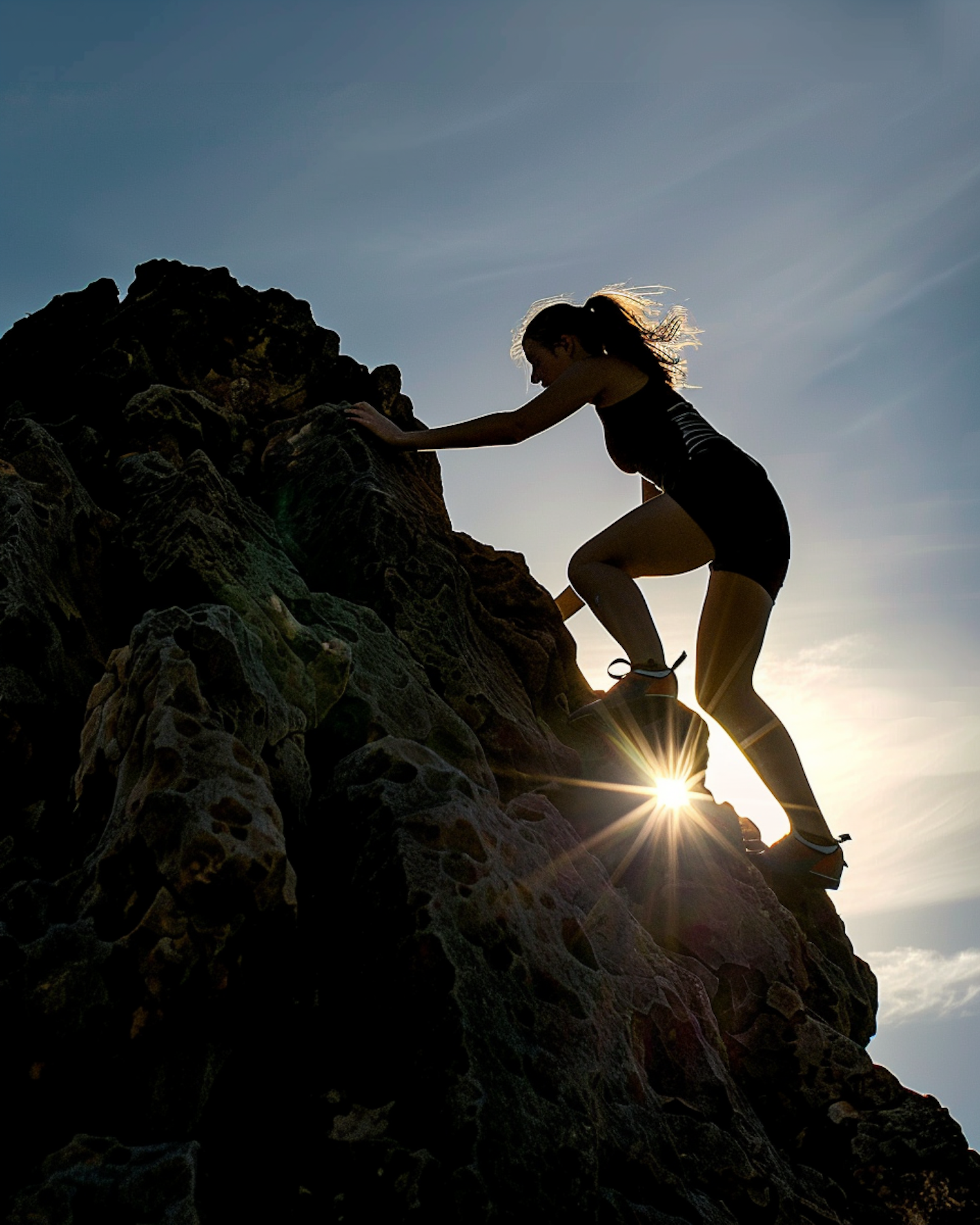Silhouette of a woman rock climbing with sunburst through her legs, rugged rocks, and a clear sky, evoking adventure and determination.