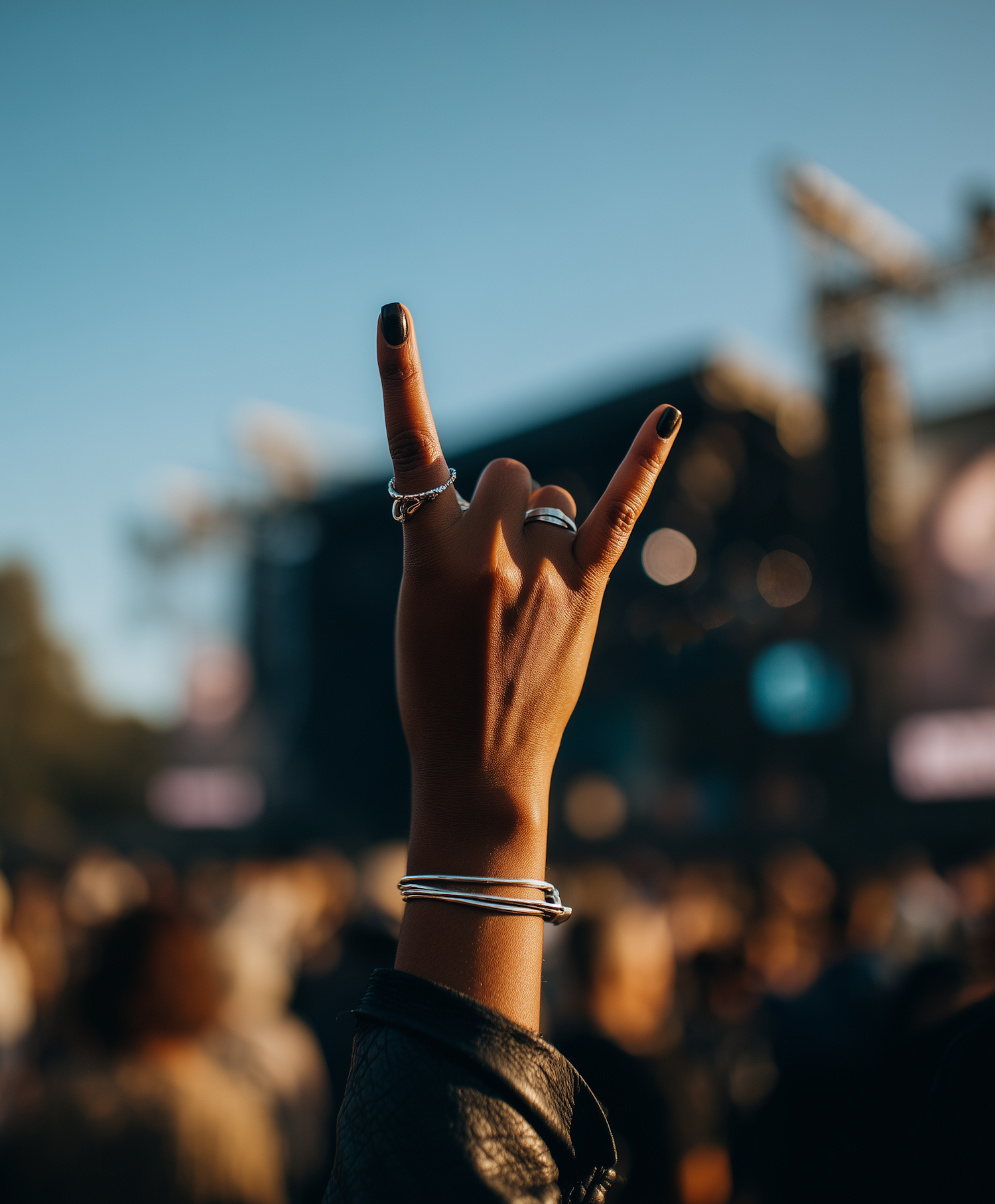 A hand making a rock-and-roll gesture at a live music event, adorned with silver jewelry and black nail polish, against a blurred crowd and stage.