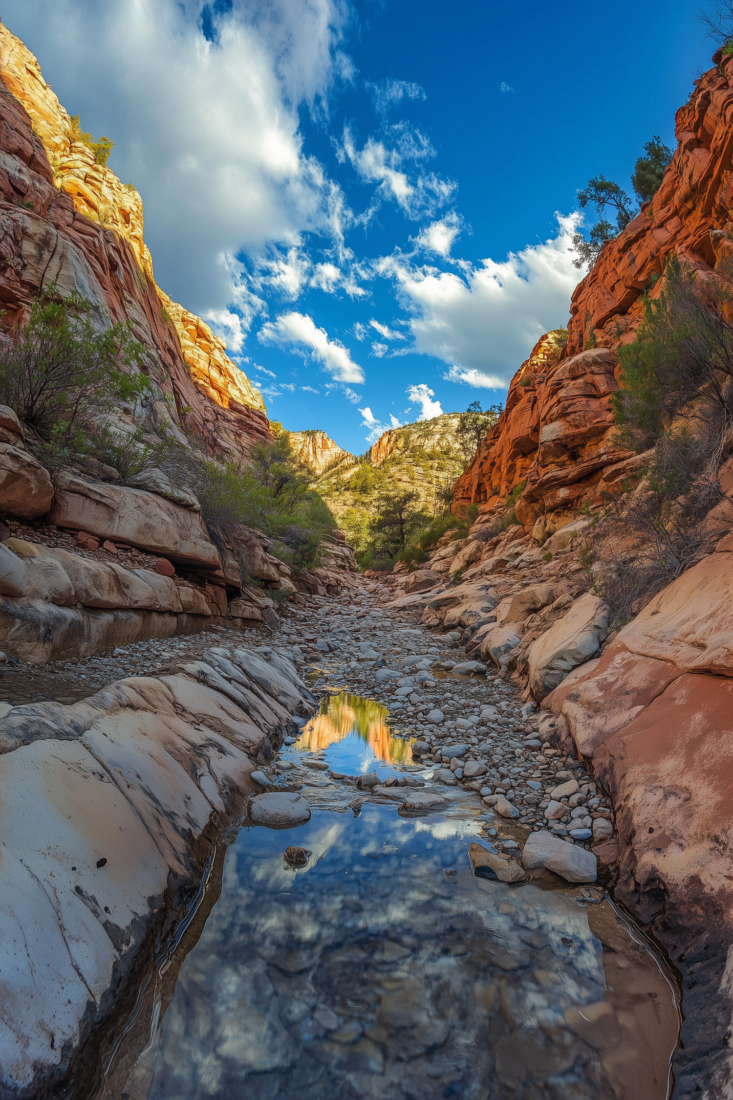 Breathtaking canyon with red rock formations, blue sky, and a reflective stream. Dramatic shadows and sparse greenery enhance the scene.