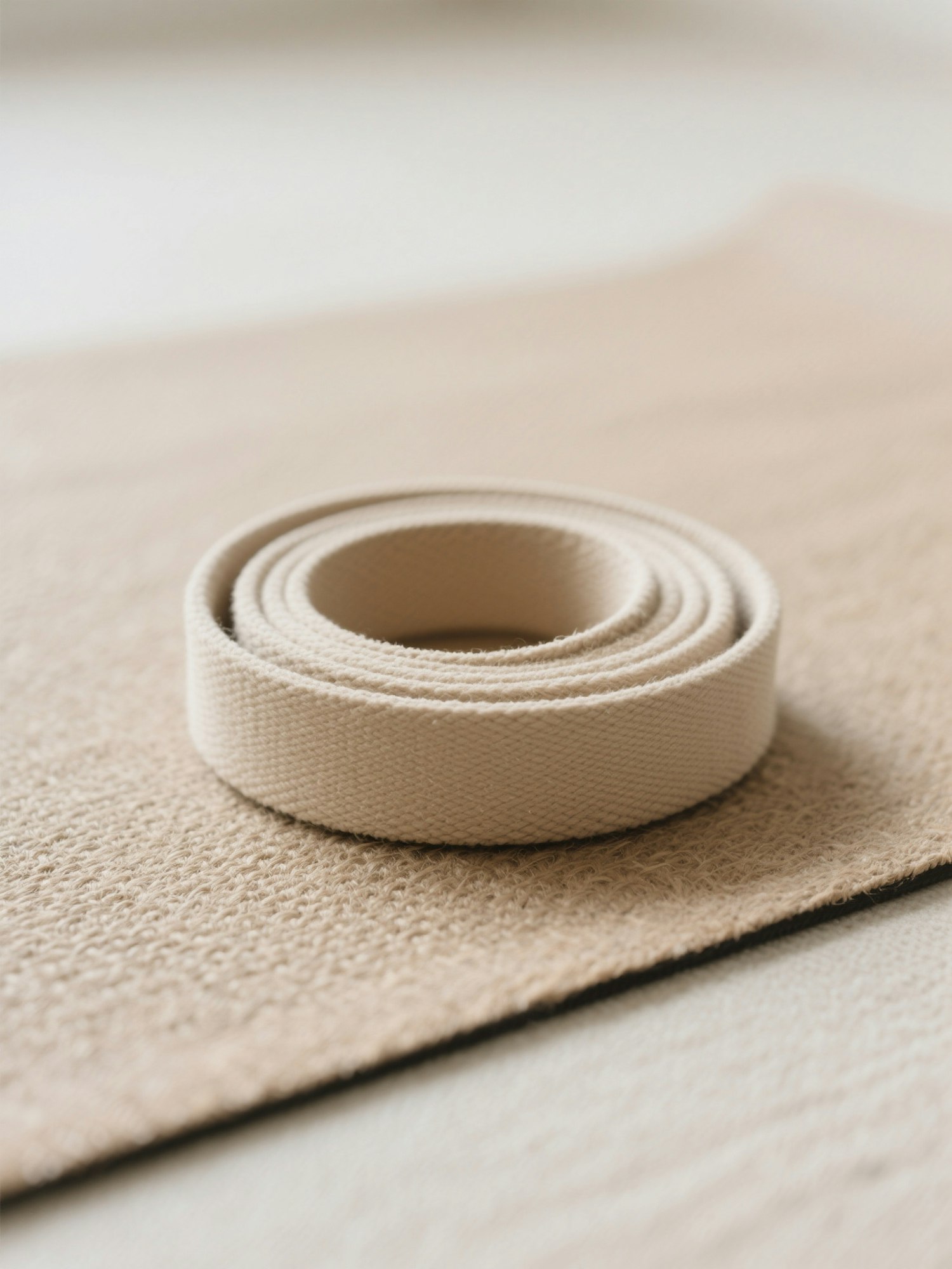 Minimalist, aesthetic editorial photography, soft neutral tones such as cream and taupe, clean background, gentle diffused light, high resolution — coiled beige yoga strap placed on a textured jute yoga mat, soft focus edges and subtle shadow