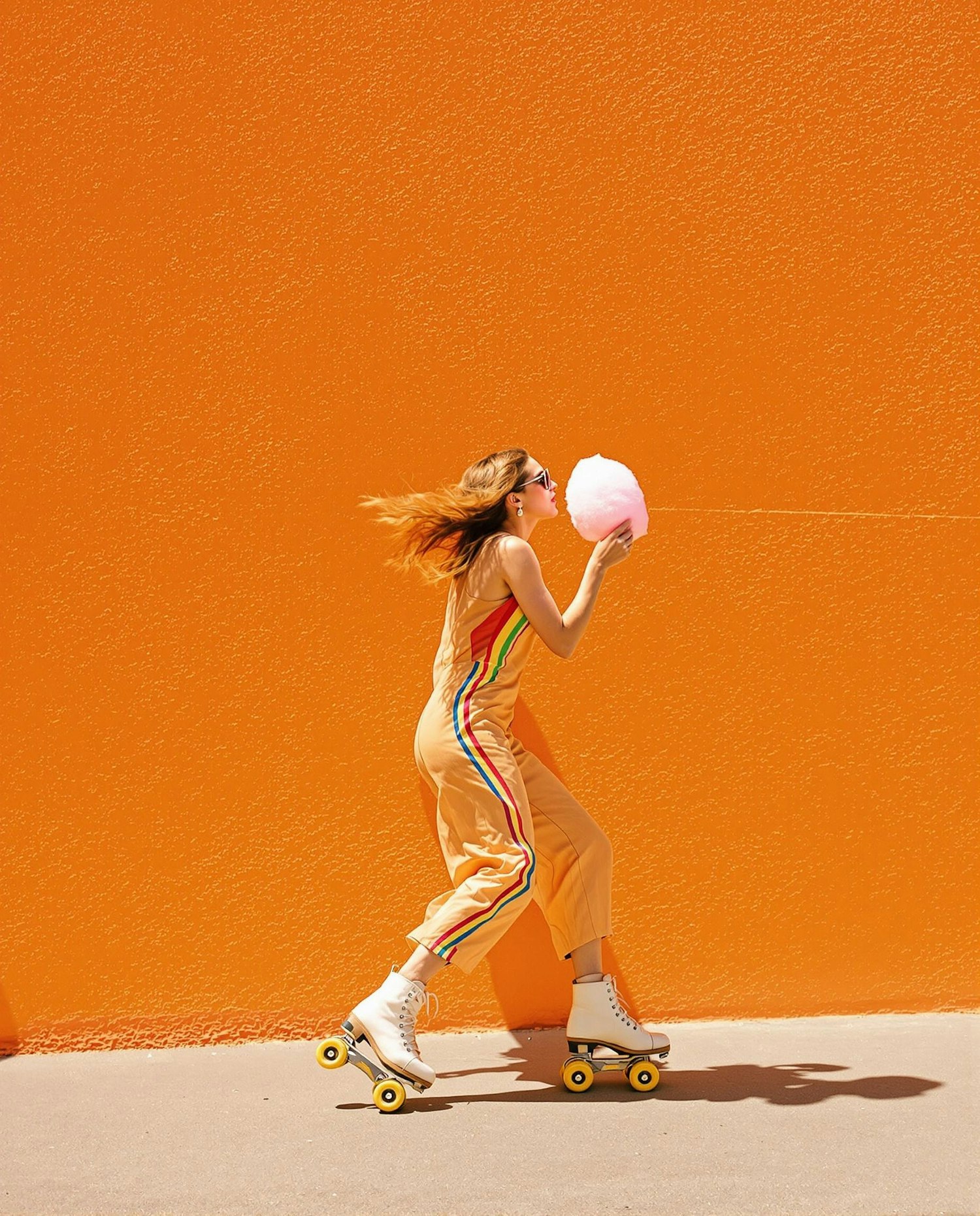 A woman in a retro yellow jumpsuit roller skates by an orange wall, holding pink cotton candy. Bright, fun, and full of summer vibes!