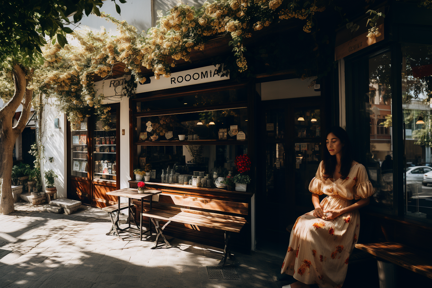 A woman in a floral dress relaxes outside a charming café, surrounded by lush greenery and warm sunlight.
