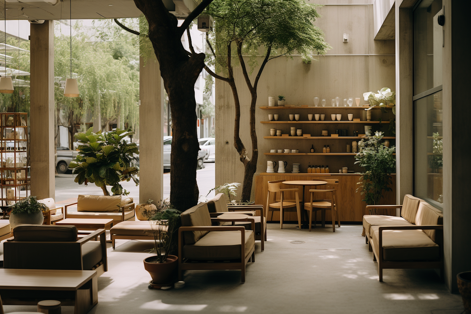 Stylish indoor cafe with wooden furniture, lush greenery, and ceramic decor, creating a serene and inviting atmosphere.