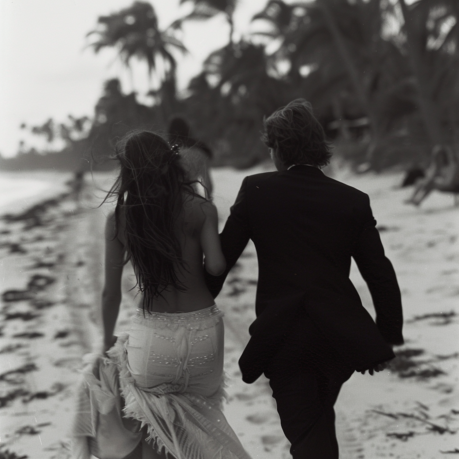 Black and white photo of a couple running on a beach, with palm trees and ocean in the background, capturing a romantic and spontaneous moment.