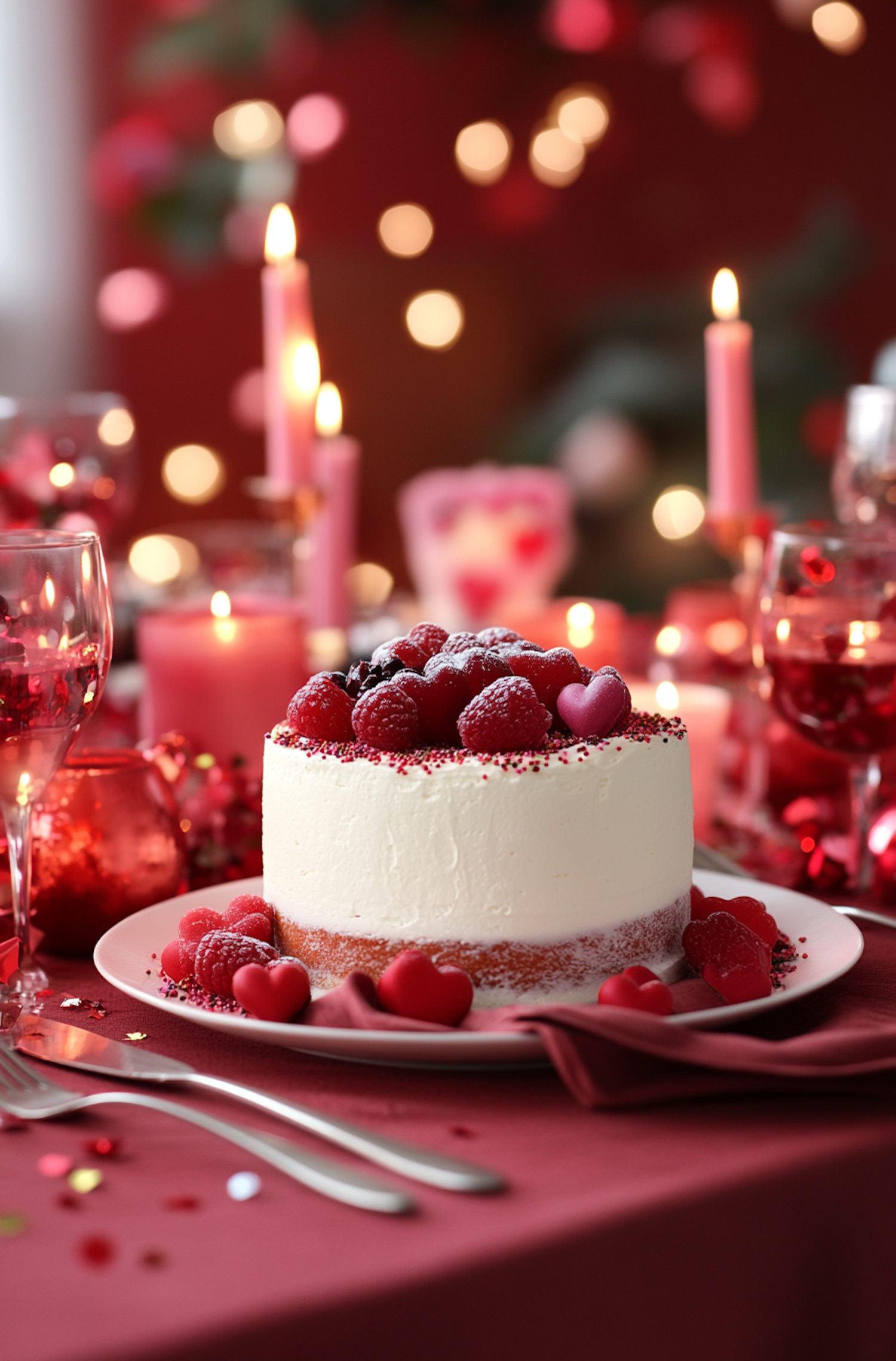 Romantic table setting with a raspberry-topped cake, heart candies, and glowing candles, perfect for a special celebration.