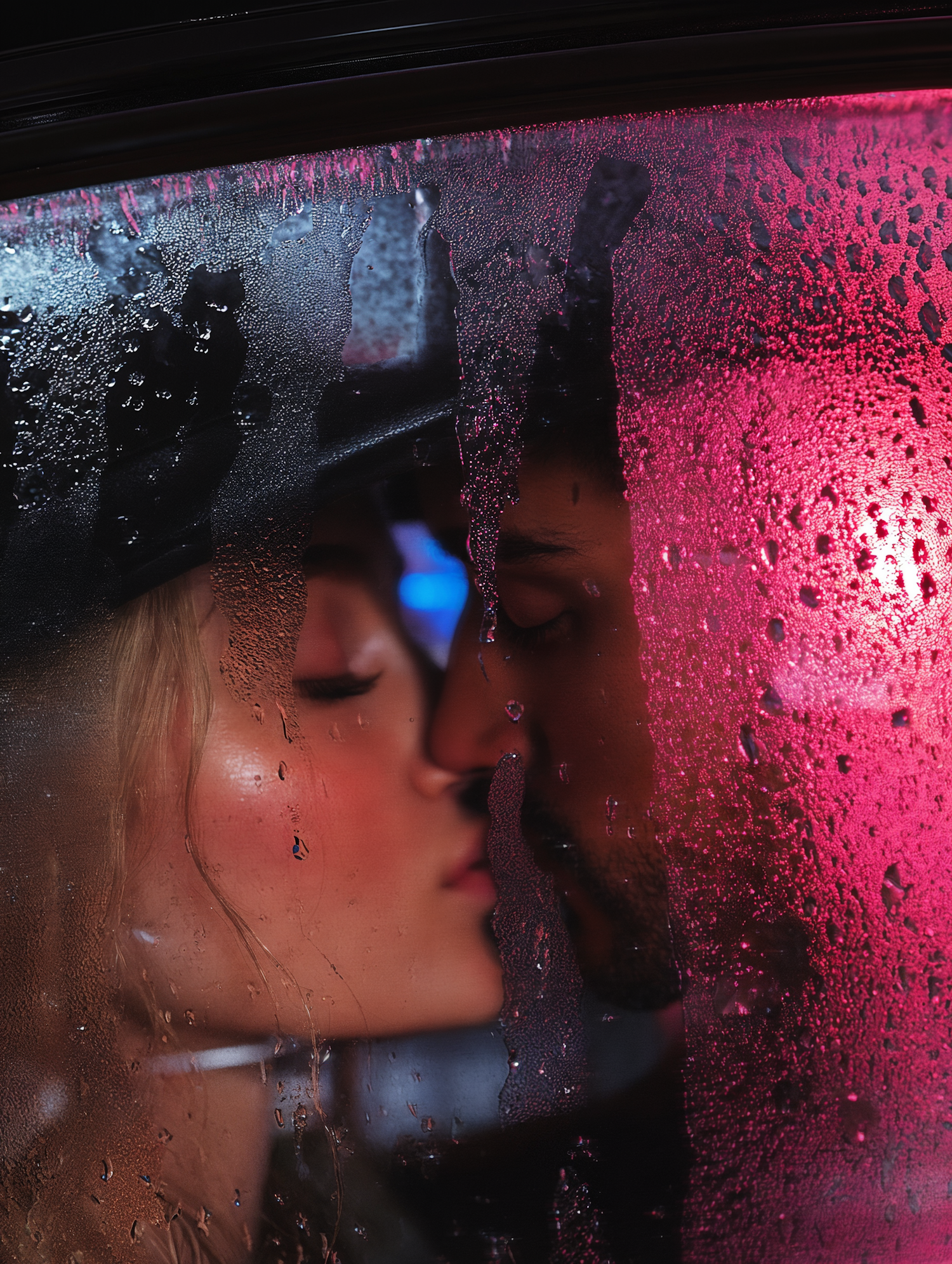 A romantic moment captured through a fogged car window, with pink and blue lighting adding a dreamy, intimate vibe to the scene.
