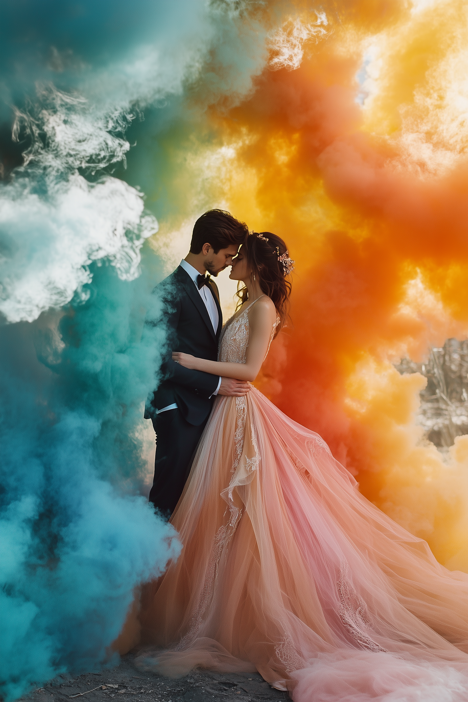 Romantic couple in elegant attire embraces amid vibrant blue and orange smoke, creating a dreamy and colorful scene.