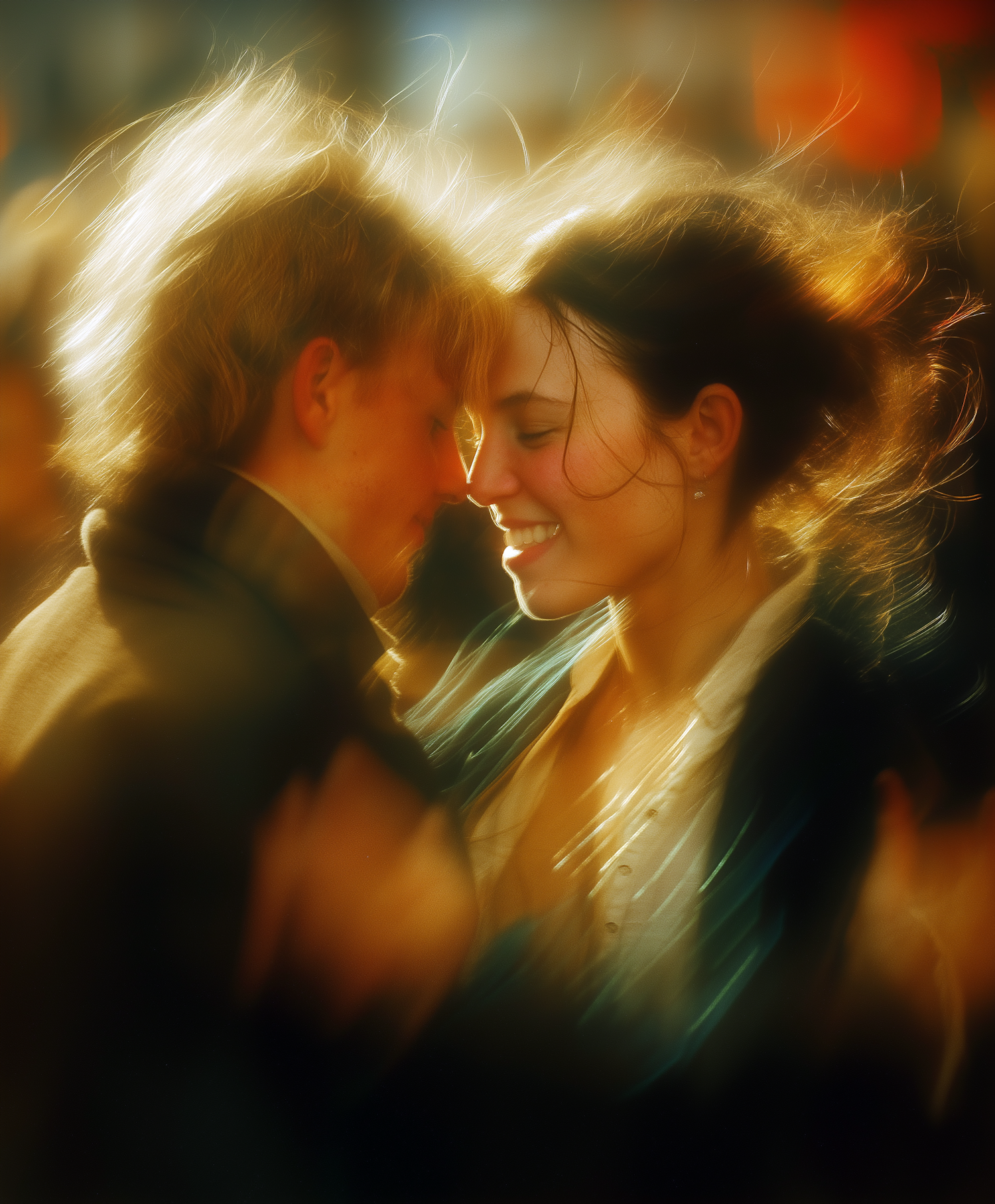 A dreamy, romantic moment captured between a couple, with warm lighting and a soft, blurred background emphasizing their connection.
