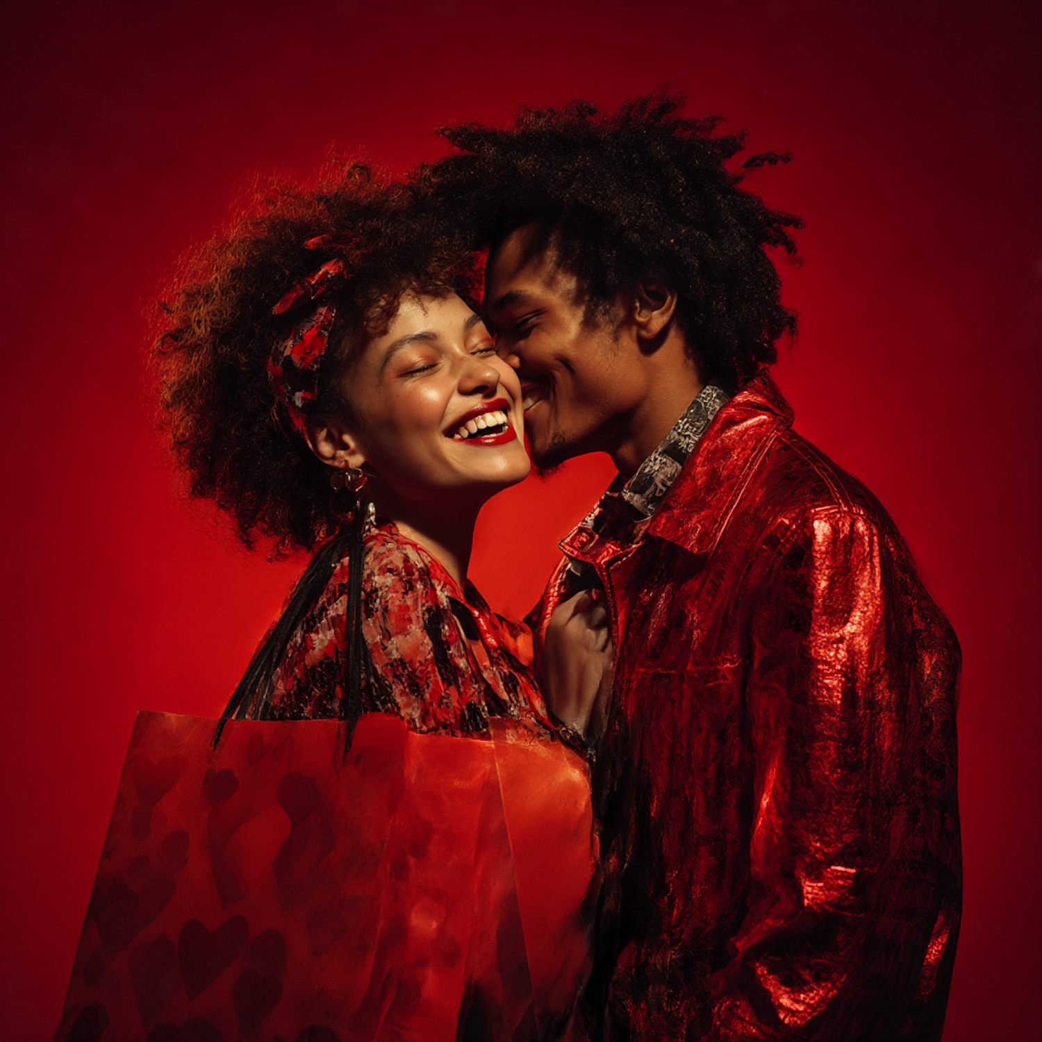 A joyful couple in vibrant red attire sharing a romantic moment, set against a bold red background with a shopping bag featuring heart motifs.