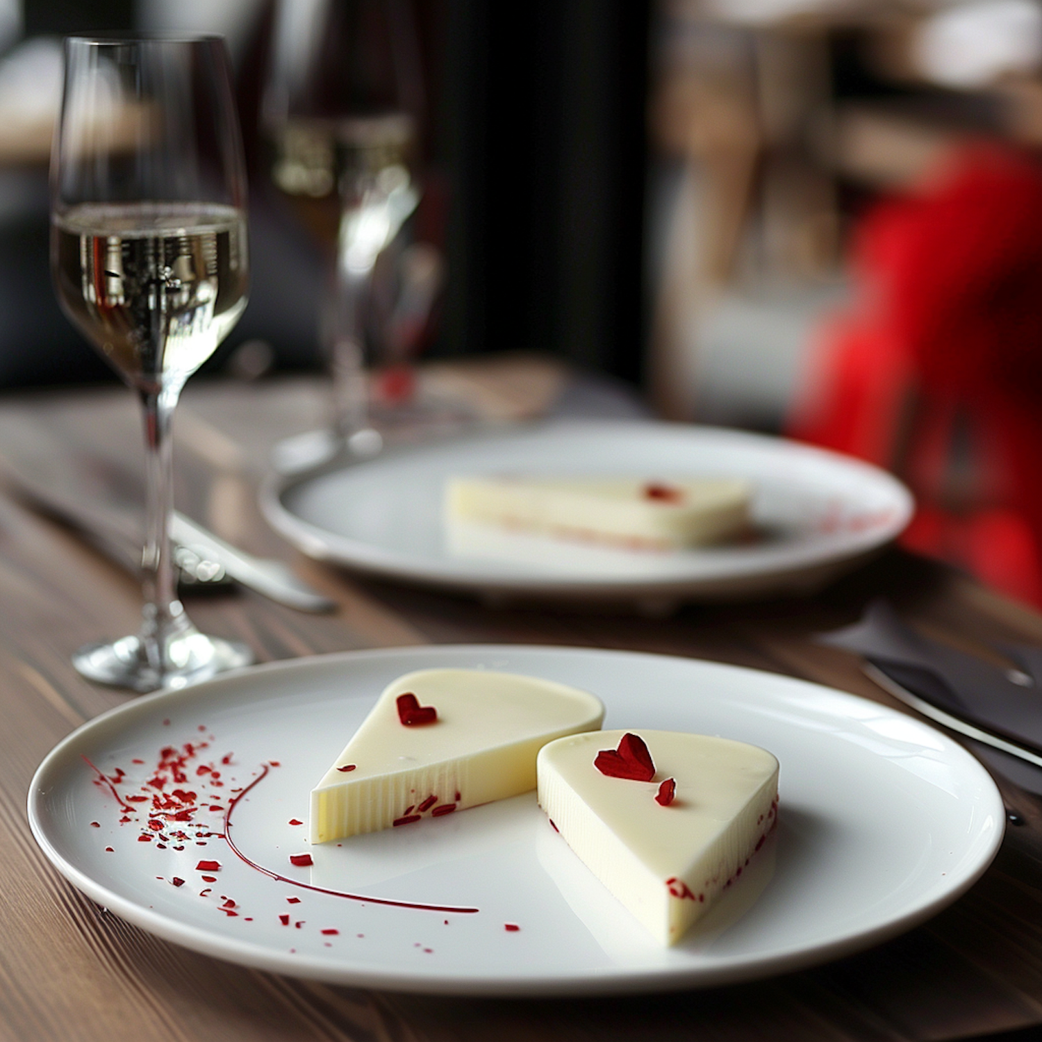 Elegant white chocolate cheesecake with red heart garnishes, paired with white wine on a wooden table. Perfect romantic dining setup.