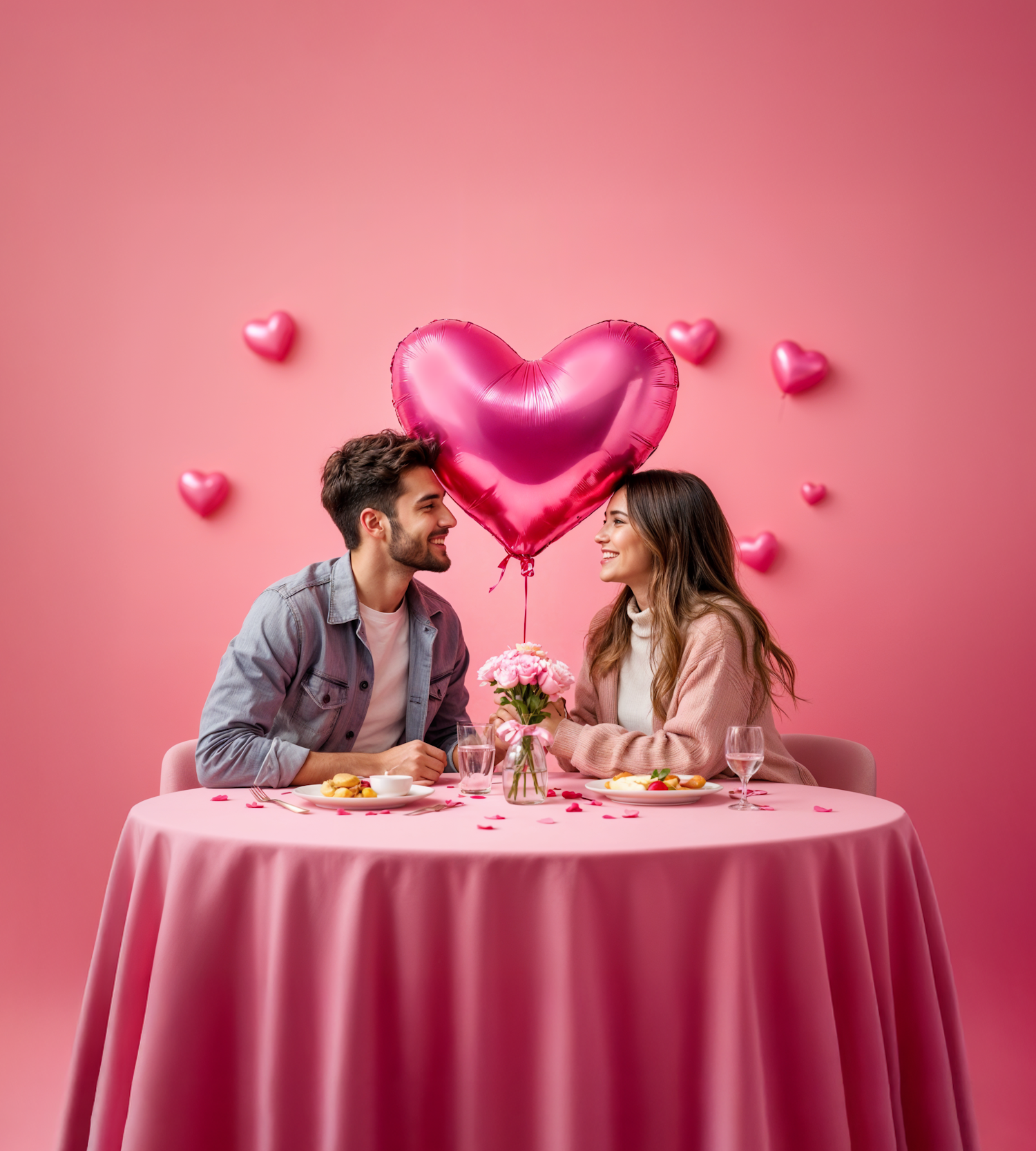 A couple enjoys a romantic meal with pink decor, heart balloons, and flowers, creating a warm and loving atmosphere.