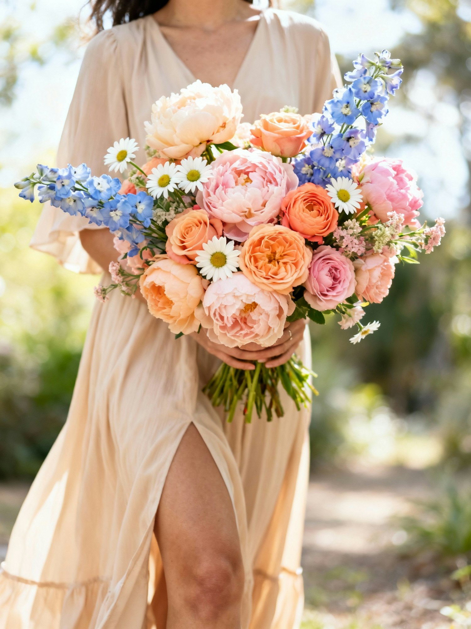 Vibrant bold aesthetic photograph, natural lifestyle style, soft daylight, candid framing, rich textures, colorful flower bouquet, not staged, influencer style photography, high quality realistic details — A person in a flowy light beige dress holding a bouquet of pastel flowers, mix of peonies, roses, daisies and delphiniums in periwinkle, peach and soft pink tones, bouquet lush and romantic, candid framing showing from mid-thigh upwards, natural lifestyle energy