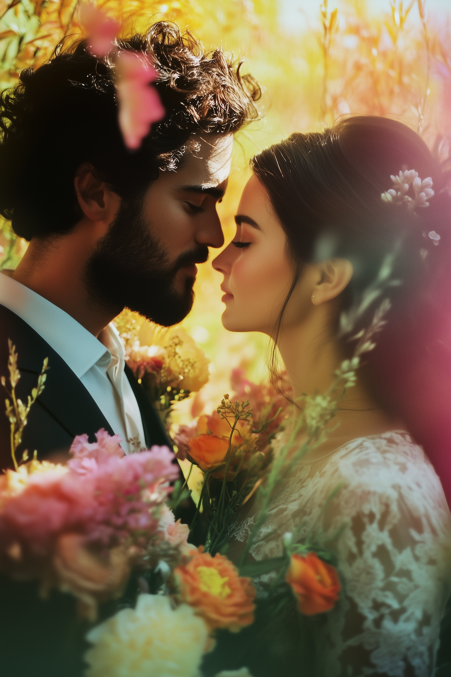Romantic couple surrounded by vibrant flowers, sharing an intimate moment with eyes closed. Warm, dreamy atmosphere.