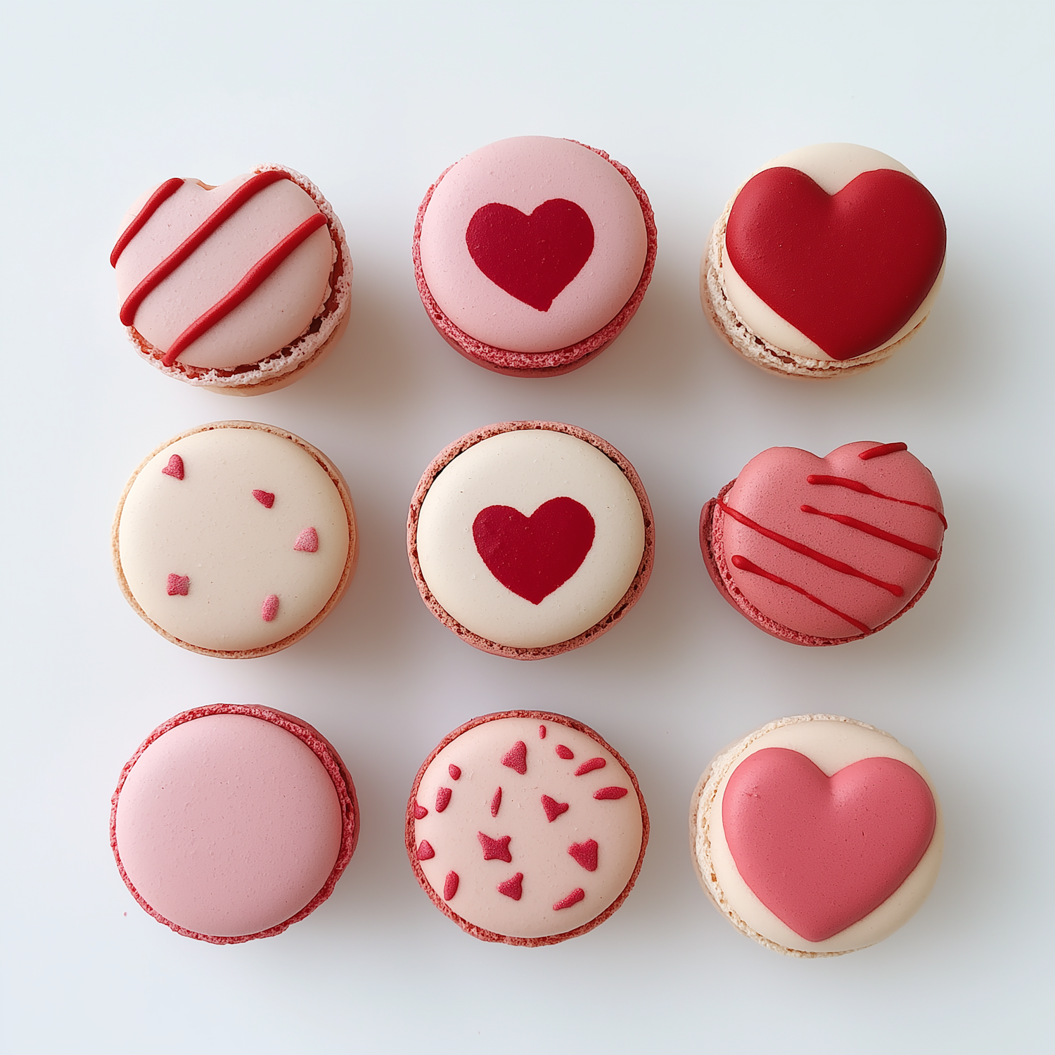 Adorable heart-themed macarons in pink, red, and cream, perfect for Valentine's Day or romantic celebrations.