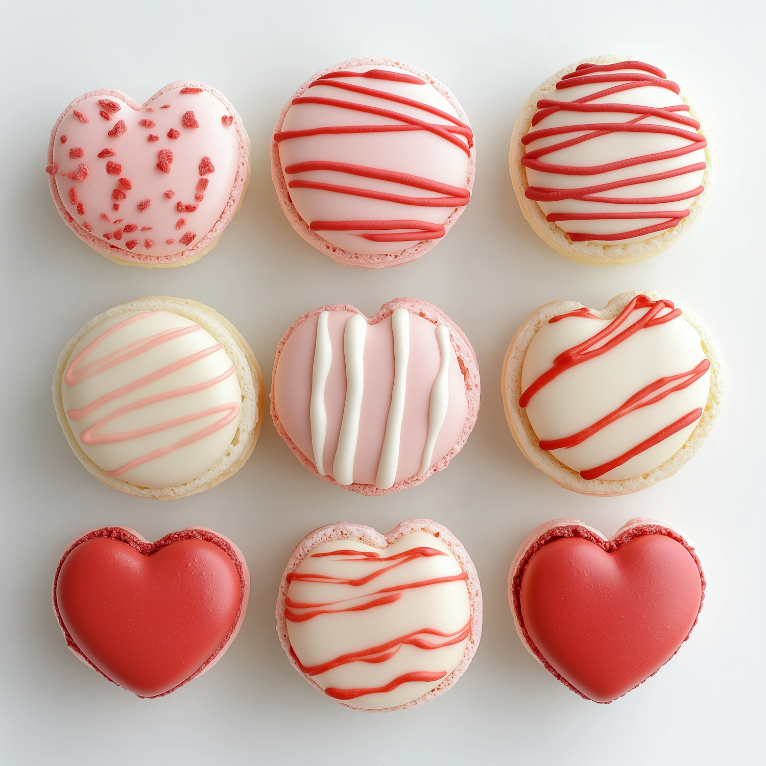 A grid of heart-shaped and round macarons in pink, red, and white, decorated with icing, sprinkles, and drizzles for a romantic vibe.
