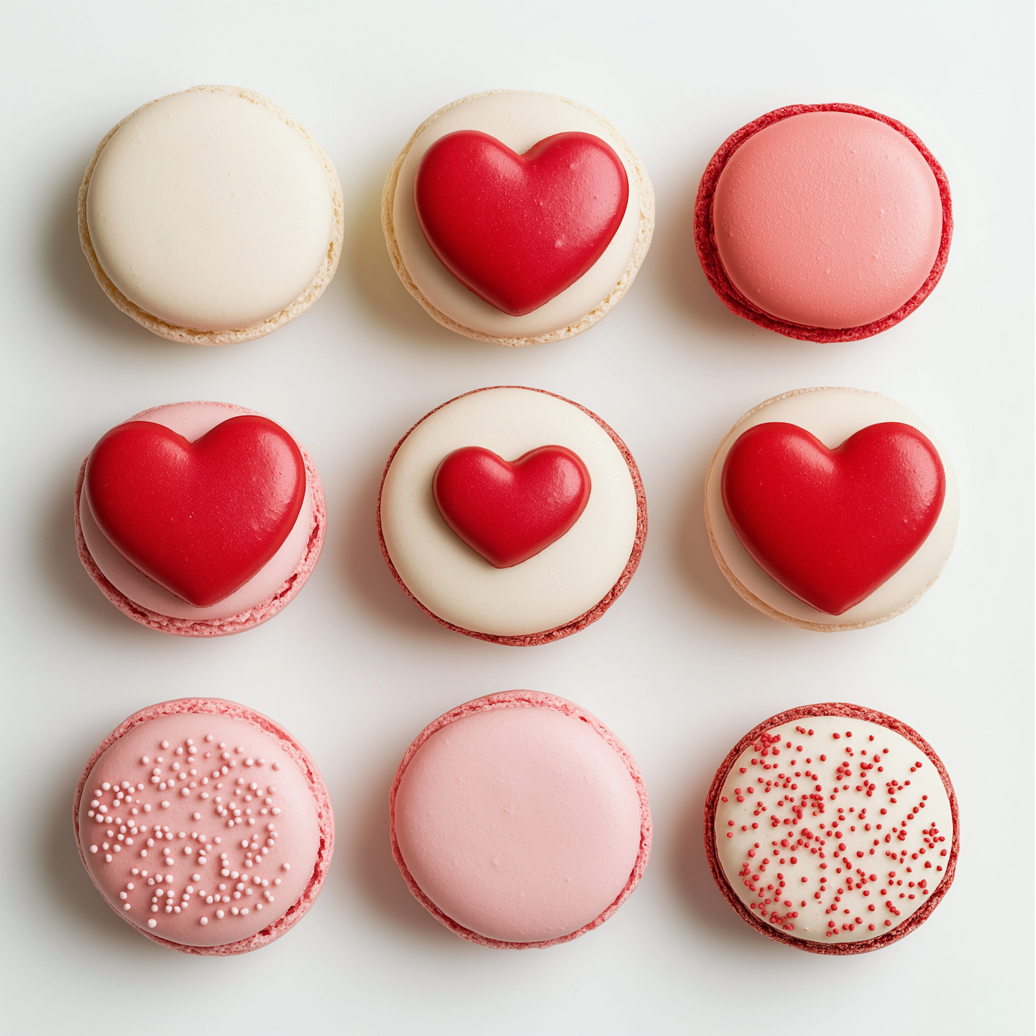 A grid of heart-themed macarons in red, pink, and white, featuring decorative hearts and sprinkles, perfect for Valentine's Day or celebrations.