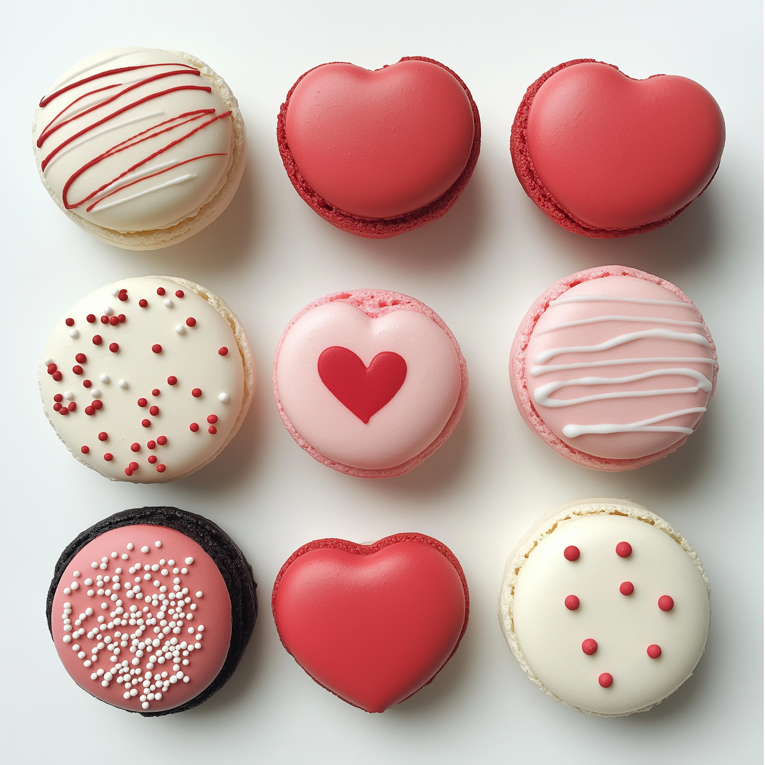 A romantic macaron assortment with heart shapes, red and pink hues, and decorative sprinkles, perfect for Valentine's Day or special occasions.
