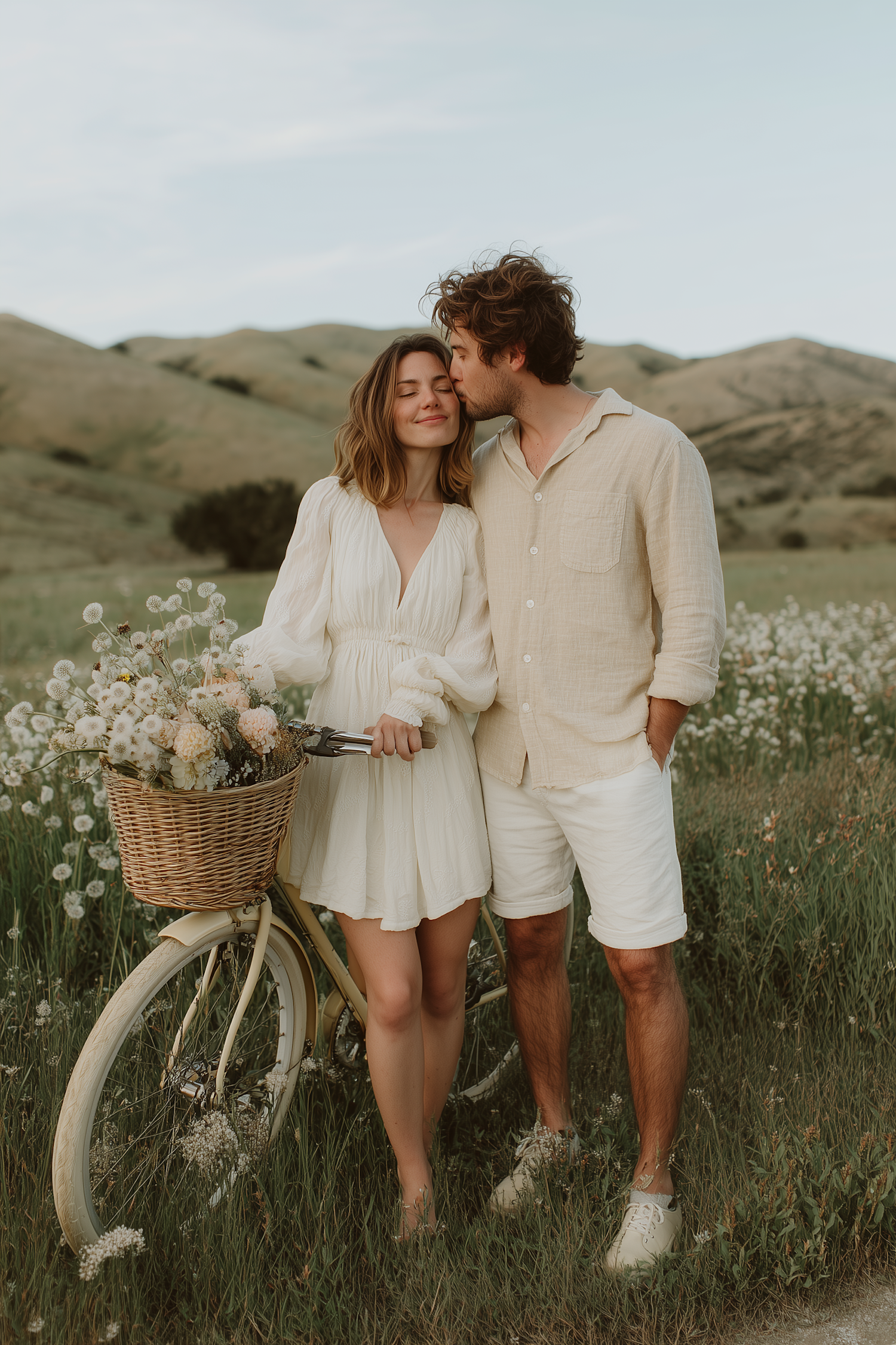 A couple shares a tender moment in a meadow, with a vintage bike and flowers adding charm to the serene outdoor setting.