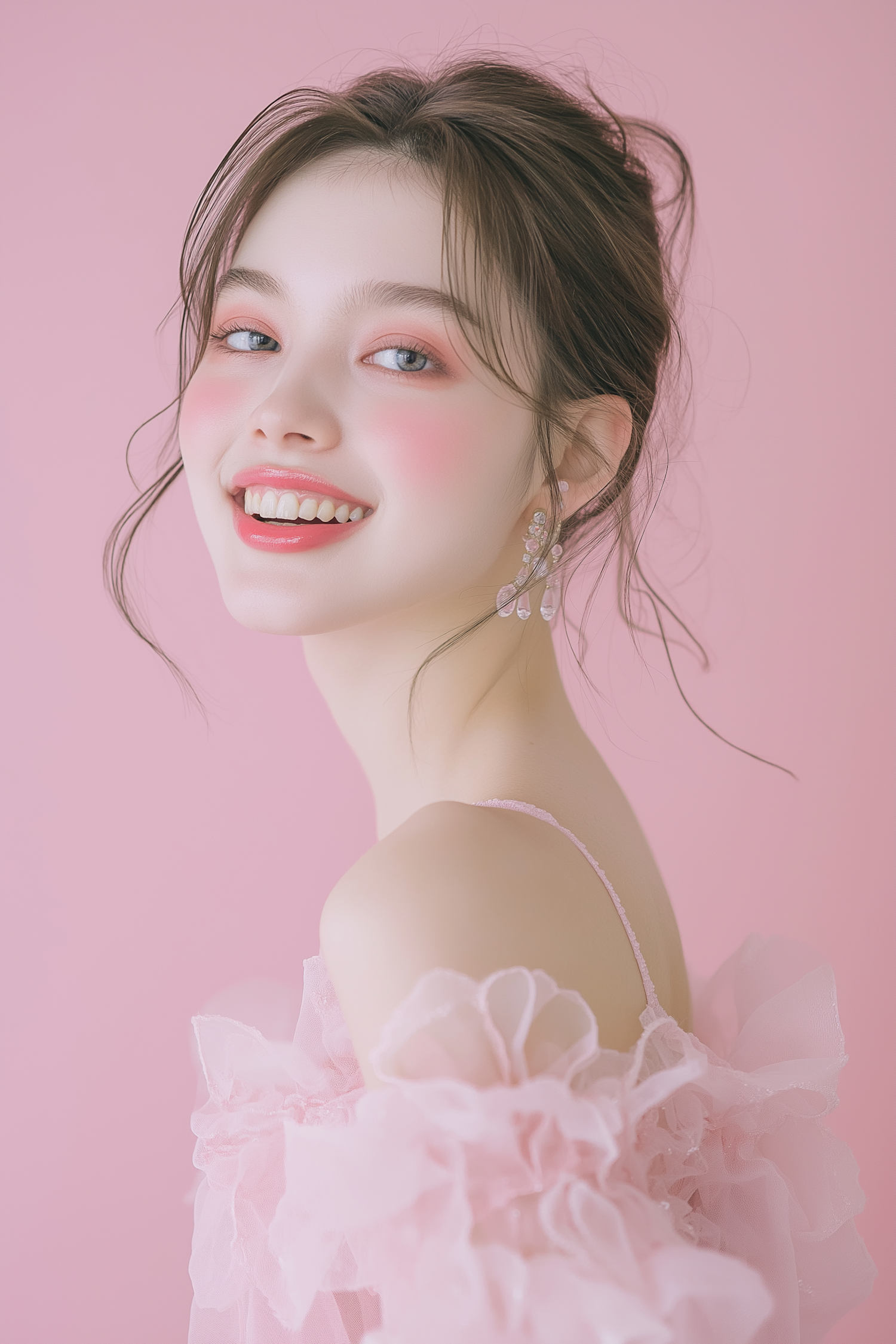 A smiling woman in a pink ruffled dress with rosy makeup and crystal earrings, set against a pastel pink background.
