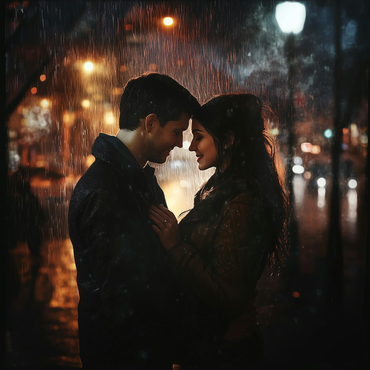 A couple shares a tender moment in the rain, illuminated by warm streetlights and surrounded by a dreamy, rainy night cityscape.
