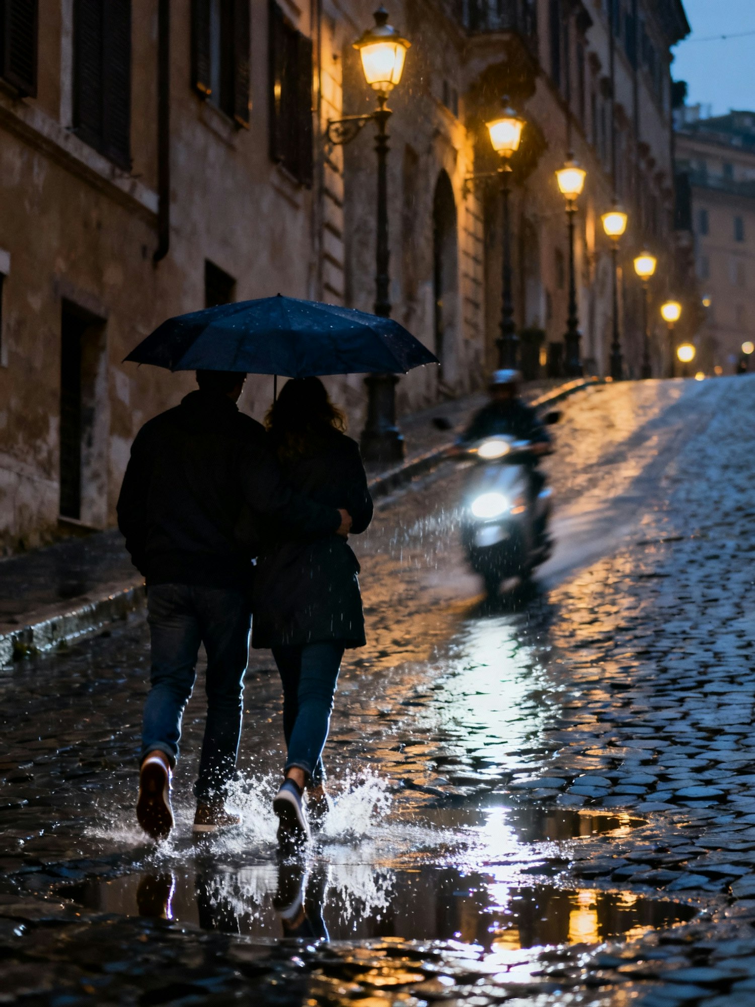 Sloped rainy street in an old European center, couple sharing one umbrella walking uphill, scooter descending blurred behind them, street lamps forming receding warm bokeh; stone pavement wet and glossy. 35 mm, 1/20 s, f/2.8, ISO 2500, WB 3700 K; brief flash to freeze shoe splash. Negative: composited fog, tourist-brand logos, oversaturated yellows.