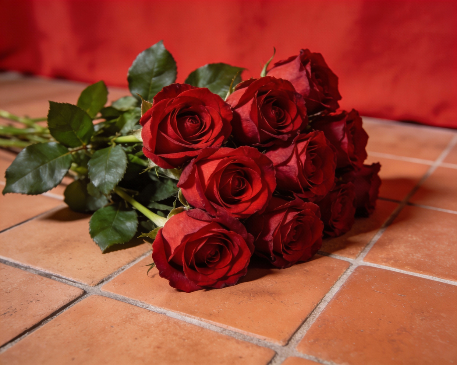 A bouquet of red roses on a terracotta-tiled floor with a red background, creating a warm and romantic atmosphere.