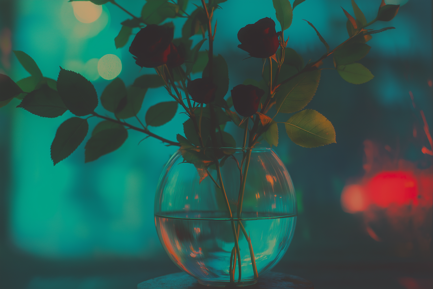 A glass vase with dark red roses and green leaves against a dreamy teal and orange blurred background. Perfect for romantic vibes.