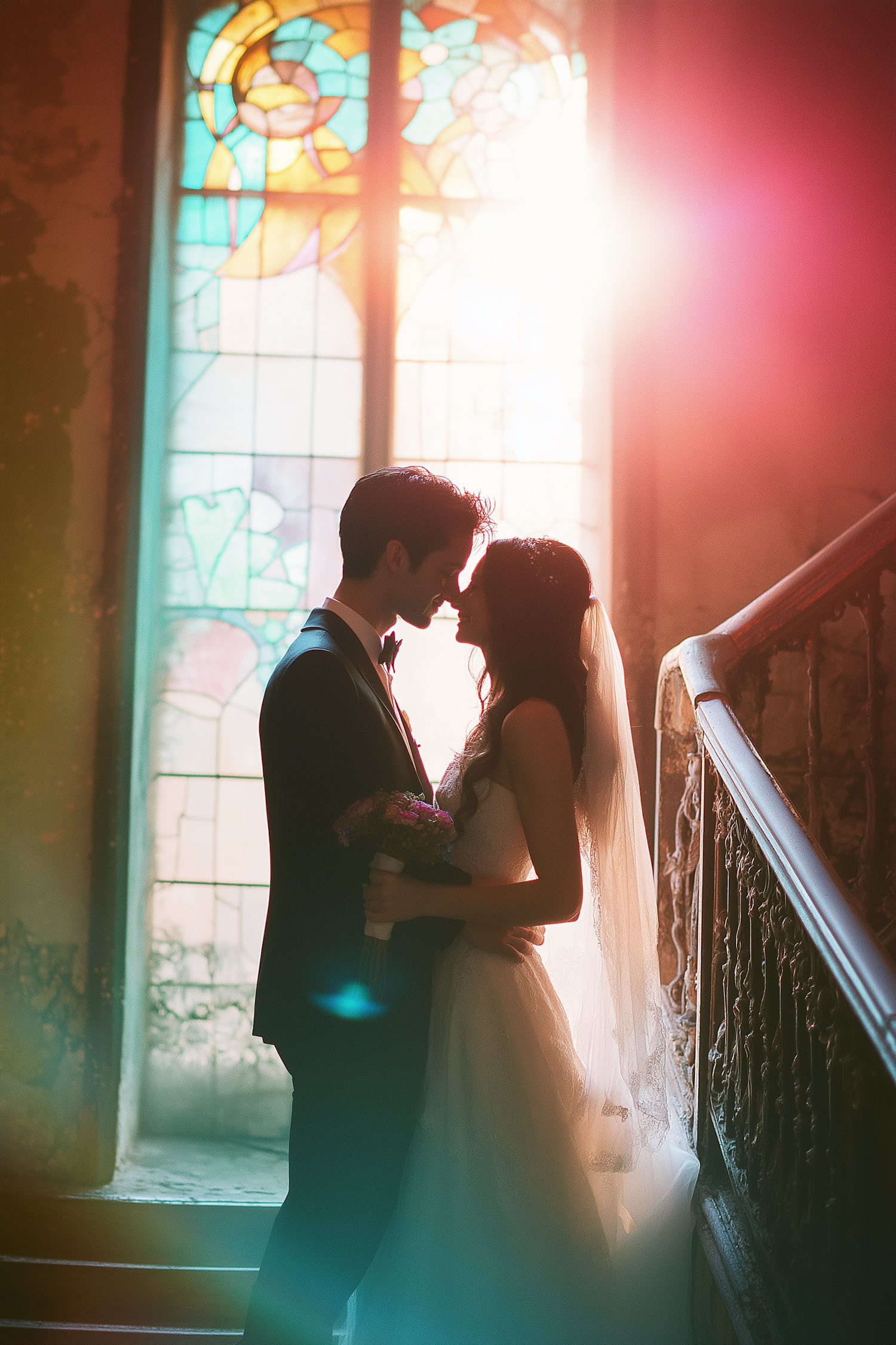 A couple in wedding attire shares a tender moment on a staircase, illuminated by colorful stained glass light.